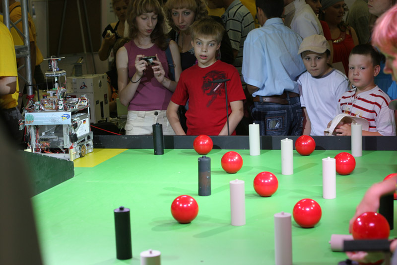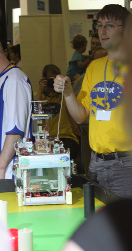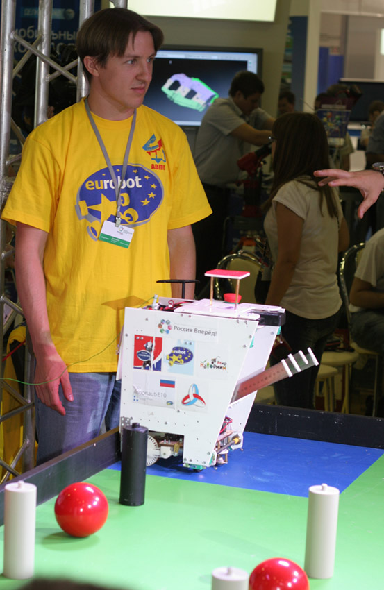 Краткая вводная - задача на этот Евробот была "мир накормим". На поле белые и черные цилиндры - кукуруза хорошая и плохая, хорошую надо собрать, плохую собирать не надо. Красные шары лежащие на поле - помидоры, оранжевые шары стоящие на полых цилиндрах - апельсины. Робот ребят с МГУ собирал апельсины, а робот немецкого университета - кукурузу. В целом, из того что я видел, немецкий робот был ощутимо более стабильным и надежным, хотя я понимаю - робот сделанный для соревнований не должен в течение нескольких часов непрерывно гонять перед детьми и показывать как он выполняет свою задачу.