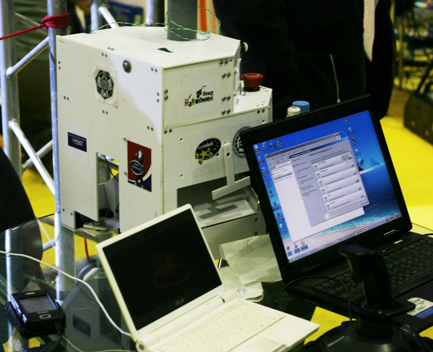 Ну и еще были роботы с УрГУ нашего местного - это к платформе от LynxMotion прикрутили манипулятор от LynxMotion и поставили ноутбук - зачем-то сделали это на стальных уже покрывающихся ржавчиной листах