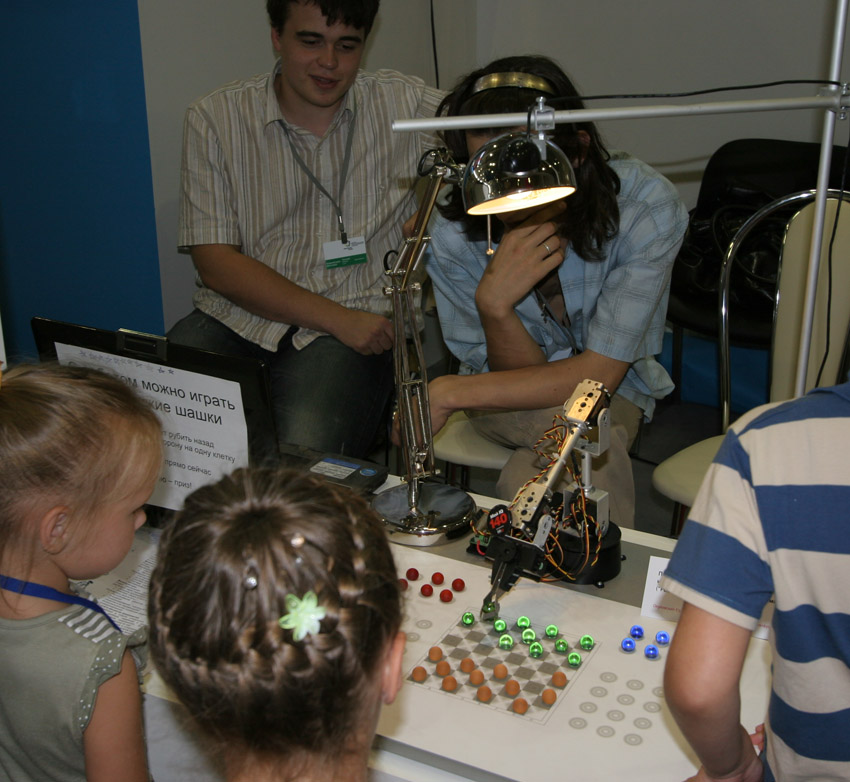 Ну и более менее интересная штука, пользующаяся стабильной популярностью у детей - шашки манипулятором от LynxMotion, в них аж сам мэр Ебурга с роботом сыграл