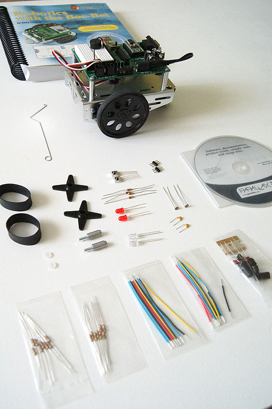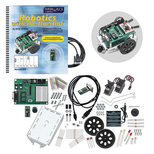 Набор Boe-Bot Educational Robot Kit представляет собой набор электронных компонентов, начиная от проводов, резисторов, конденсаторов, транзисторов и заканчивая разными датчиками - фоторезисторами, инфракрасными детекторами, датчиками давления. Также в комплект входит алюминиевая рама, 2 сервомотора, колеса и все необходимое, чтобы собрать робота. Обучающий курс Boe-Bot Robot Kit состоит из 41 урока, которые научат начинающего робототехника создавать передвигающиеся модели, начиная от самых простых и заканчивая сложными программируемыми устройствами с обилием датчиков и сенсоров. Программирование роботов осуществляется на языке BASIC.Для начала работы с набором, не требуется особых знаний в области робототехники, электроники и программирования. Рекомендованный возраст для работы с Boe-Bot Educational Robot Kit составляет от 10 лет до 120 лет.