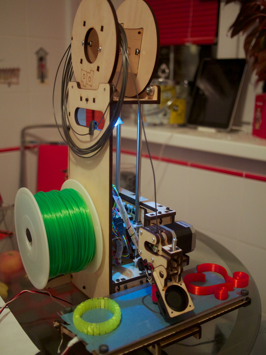 3) Напечатана и установлена пачка небольших улучшений — антивибрационные ножки, регулировка уровня платформы, LED подсветка корпуса, направляющий канал вентилятора, держатель катушки и направляющая для пластика, и т.д.