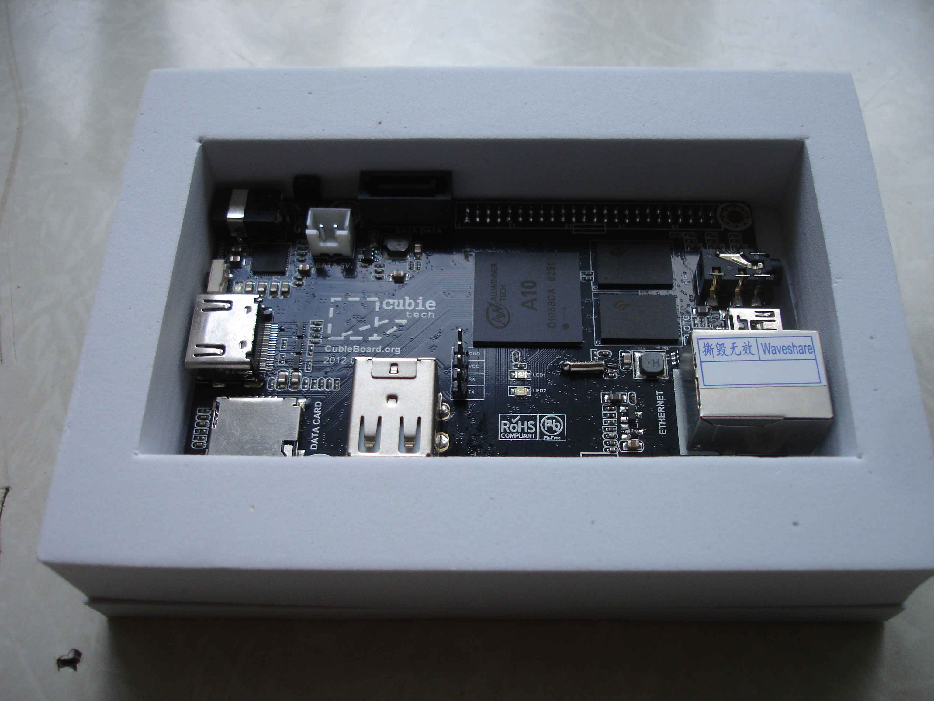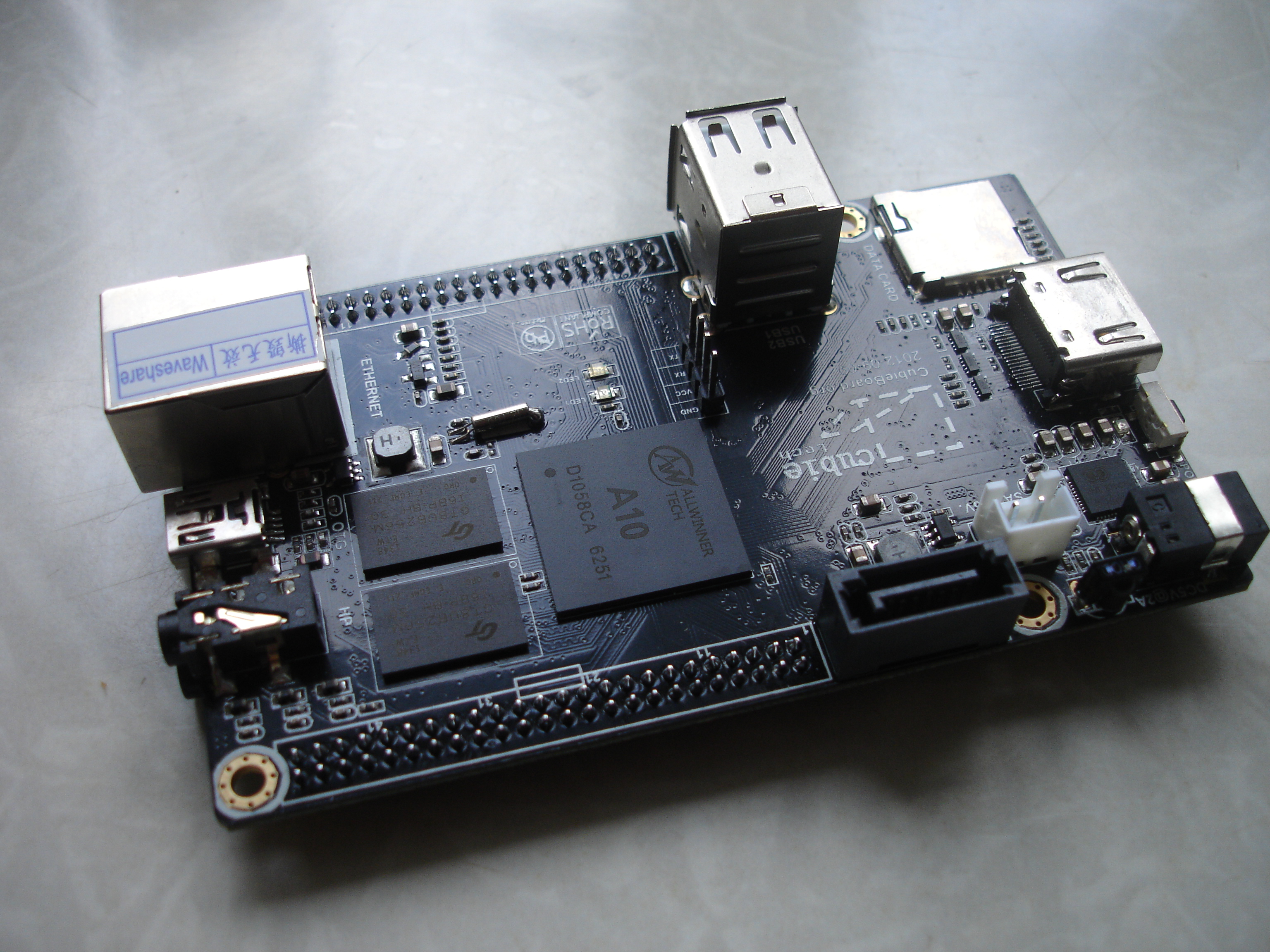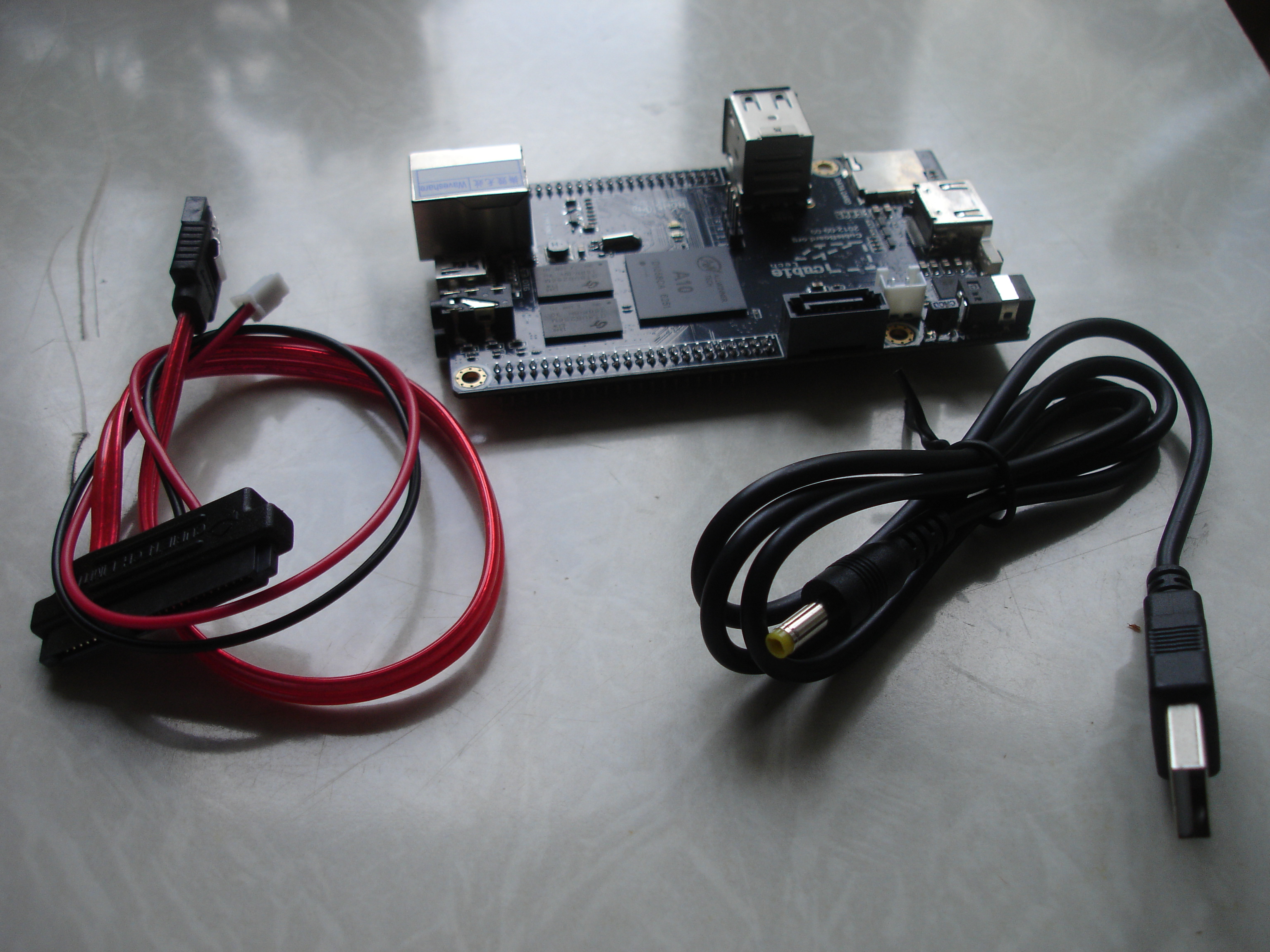 В комплекте сам Cubieboard A10, SATA-шлейф, кабель питания USB, коробка.