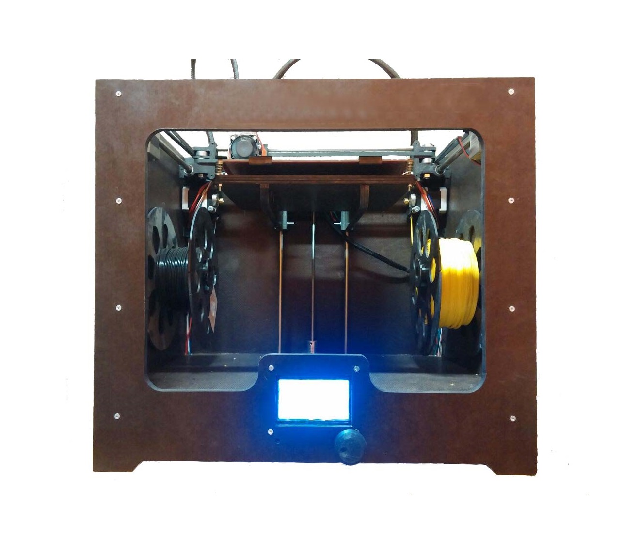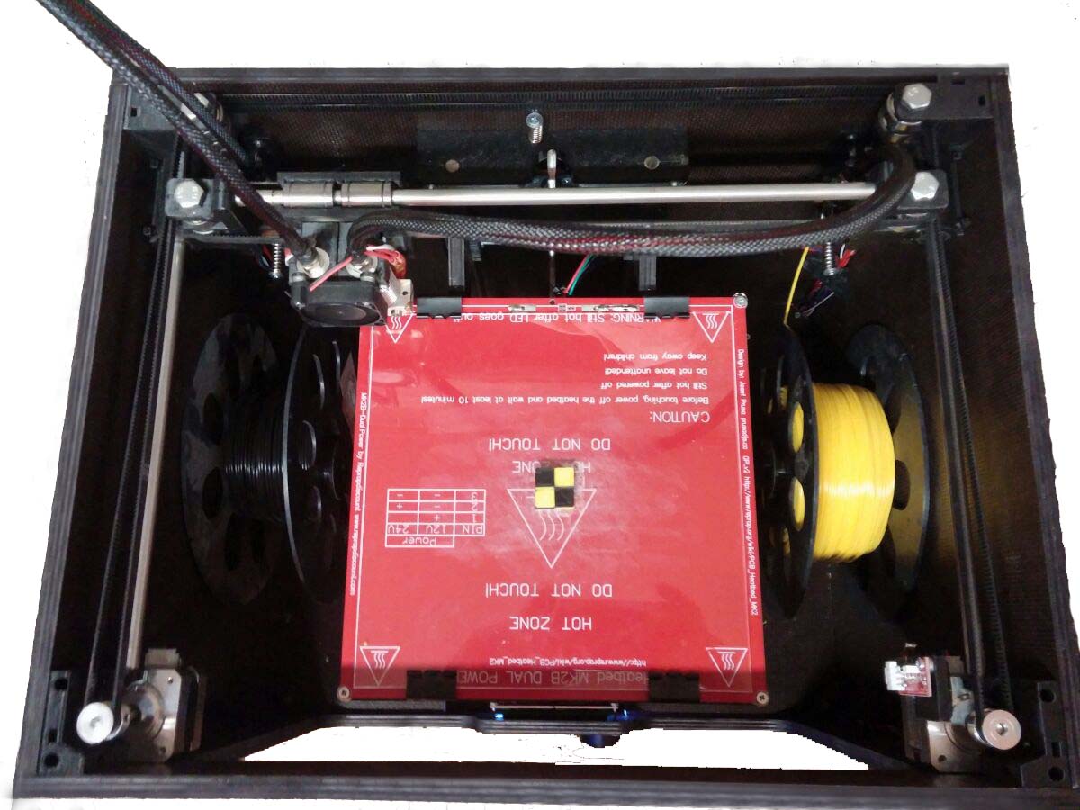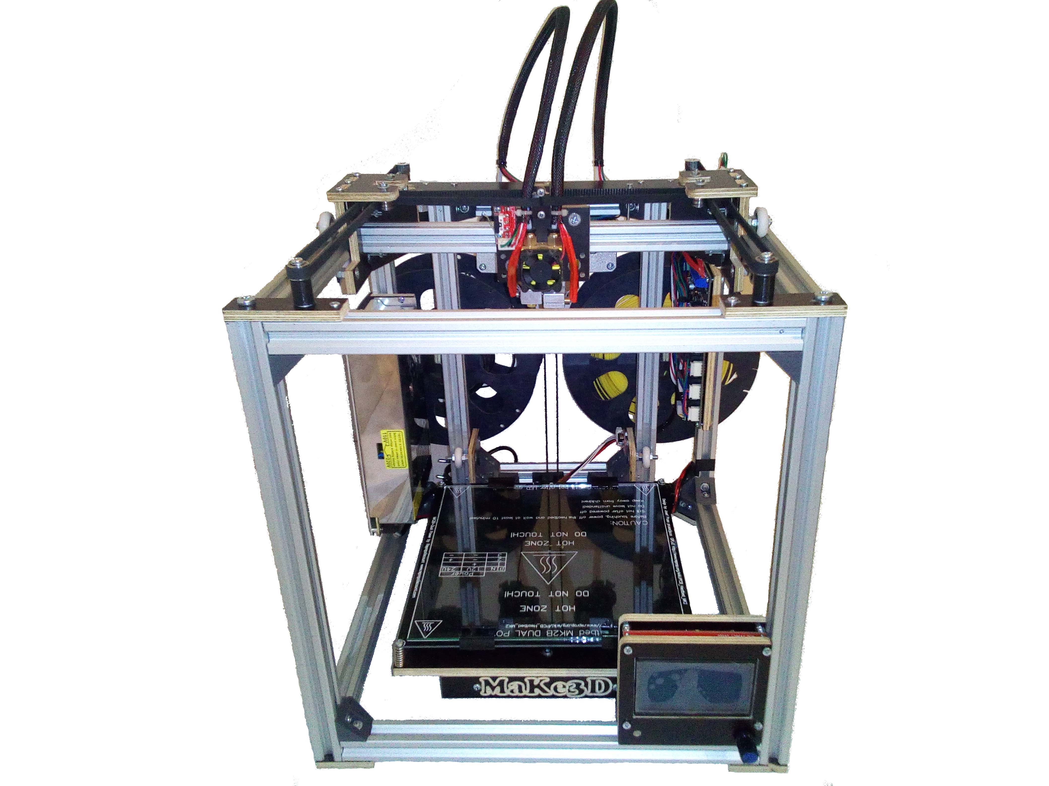 MaKe3D i4 – 3D принтер с кинематикой CoreXY (хотэнд перемещается по осям X и Y, а стол по оси Z), благодаря такой конструкции принтер печатает качественно и быстро, без вобблинга и других дефектов печати. Закрытый с 3-х сторон корпус защищает от сквозняка, детали при печати меньше подвержены деформации при усадке. У принтера достаточно большая область печати 200х200х200мм. 2 экструдера позволяют печатать двухцветные детали или сложные модели с большим количеством поддержек.