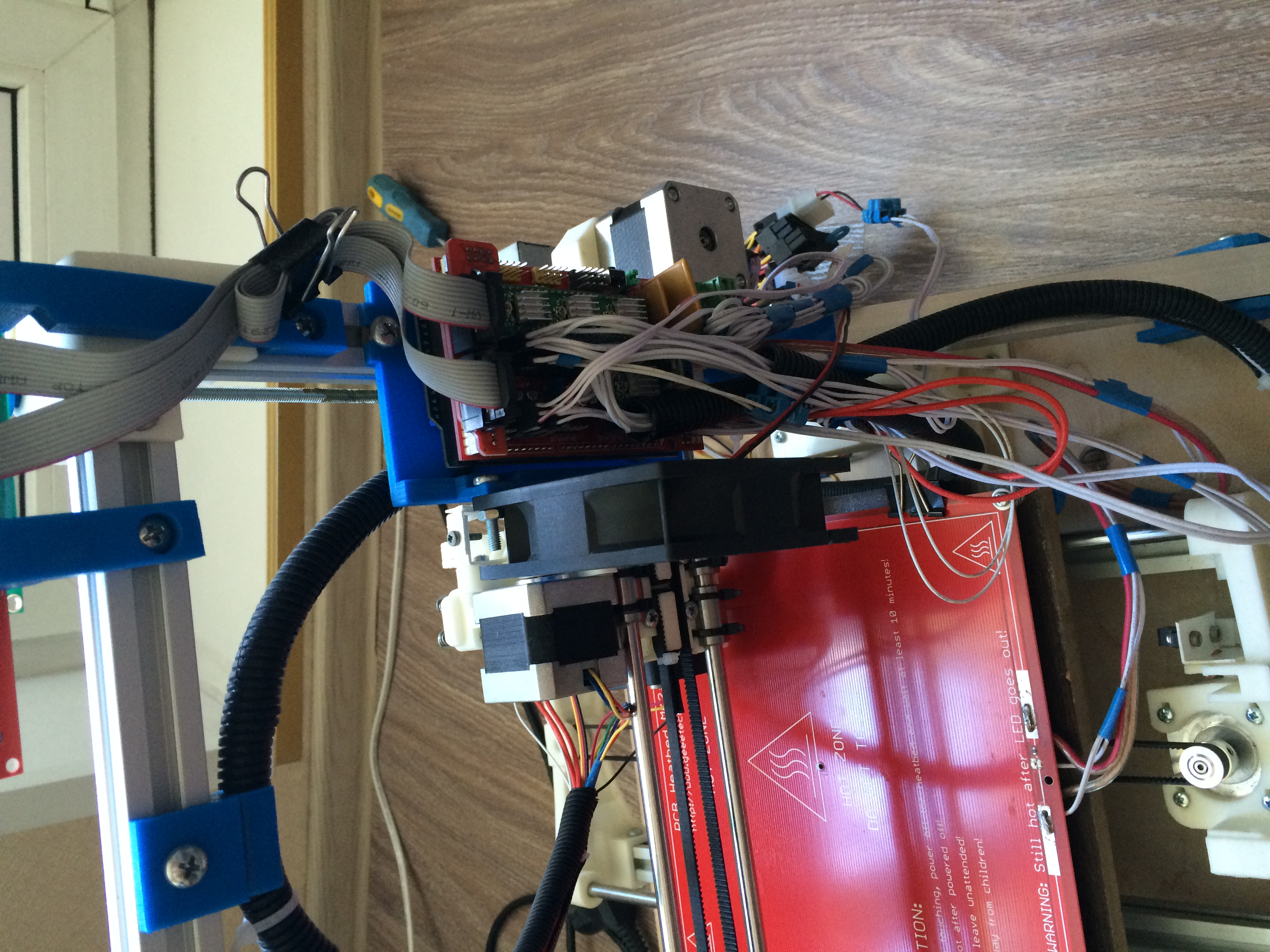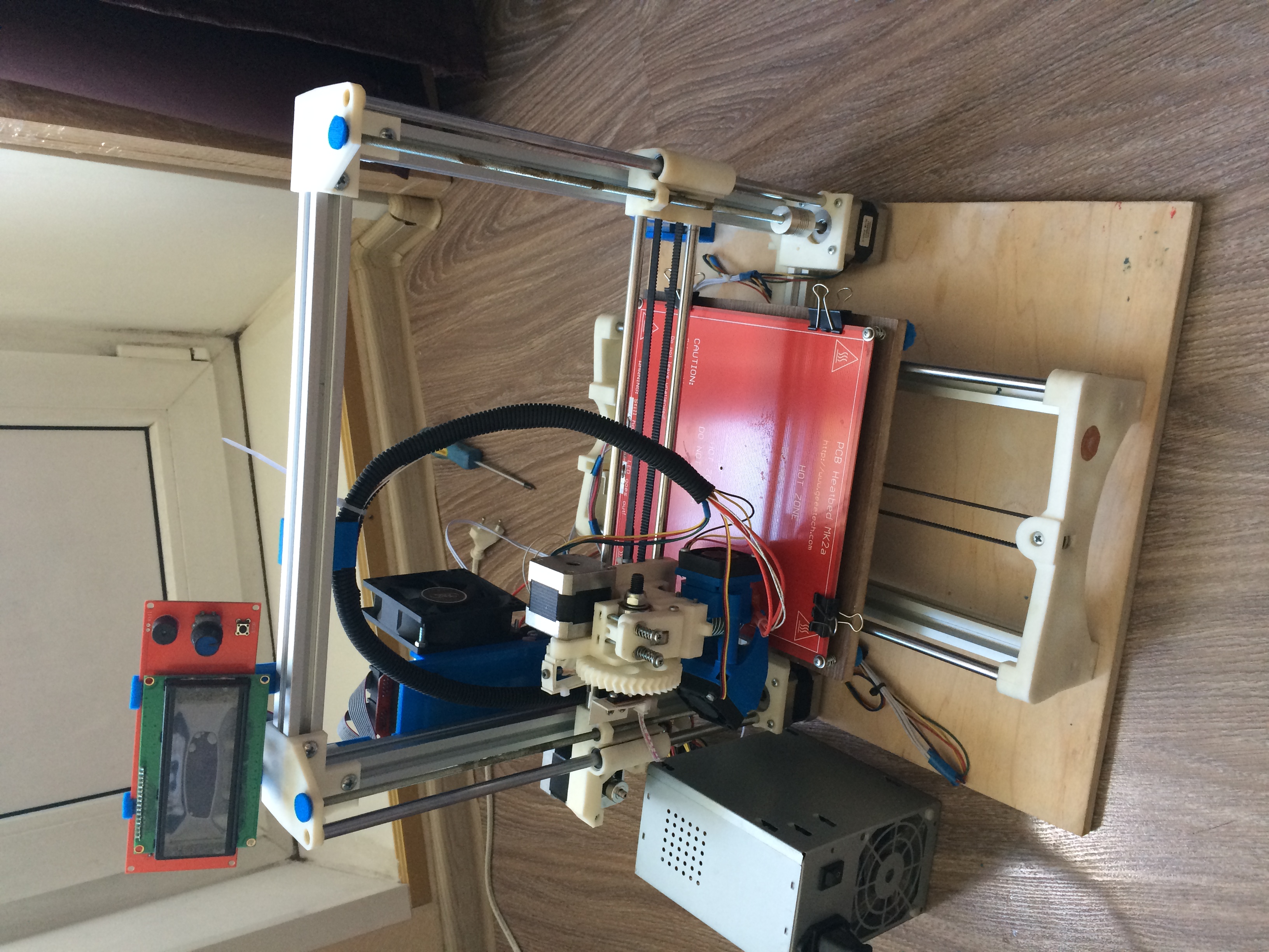 Принтер собран, в рабочем состоянии. Отпечатал на нем пол катушки синего ABS пластика. PLA так и не освоил, да и времени на сей агрегат нет.
