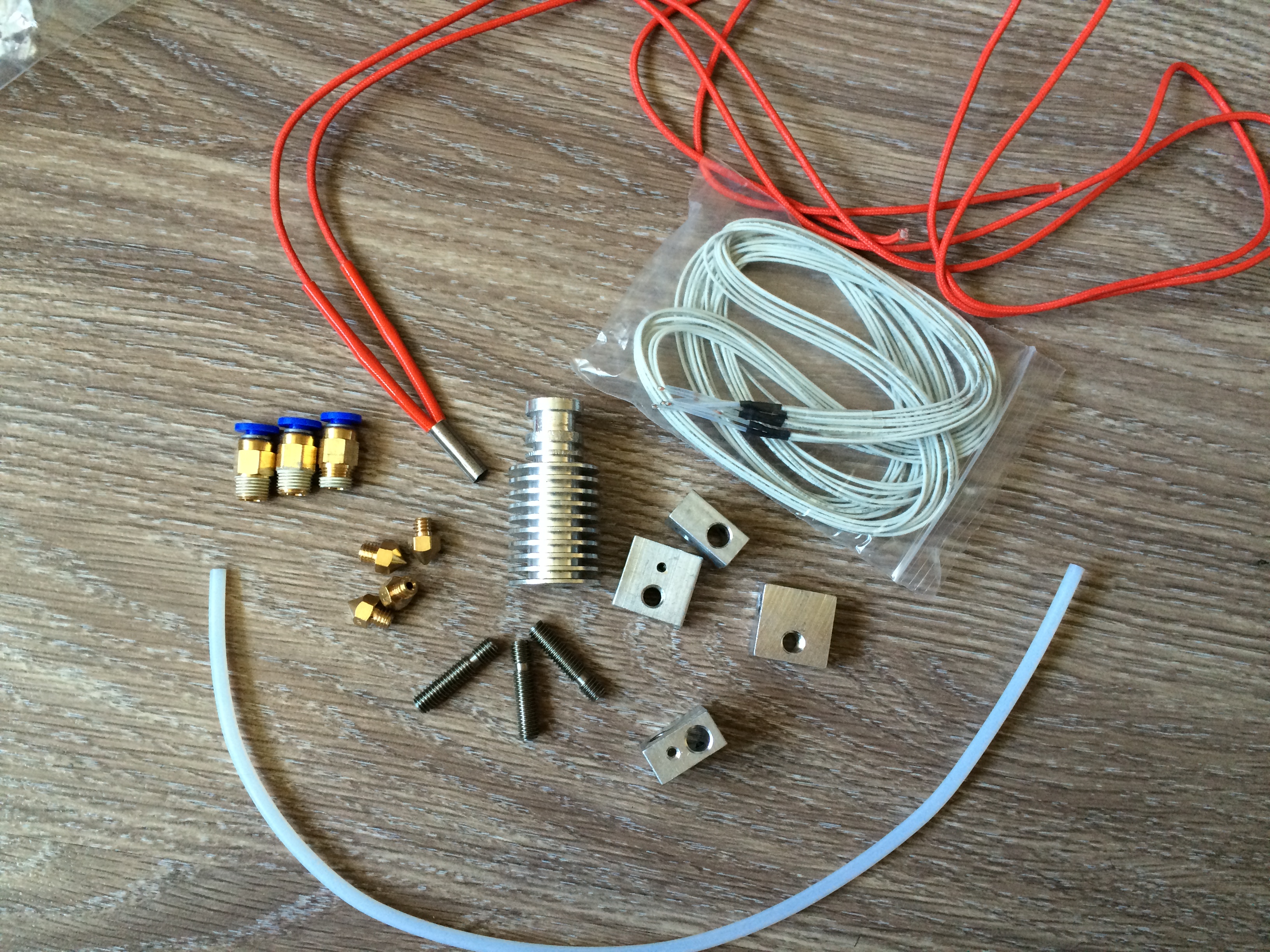В комплекте сам принтер (комплект пластиковых деталей, направляющие, алюминиевый конструкционный профиль, 5 двигателей NEMA17 с крутящим моментом 4000, Mega 2560+ RAMPS 1.4, драйверы А4988, хотенд китайский клон e3d 5 версии, да и все по списку c reprap.org).