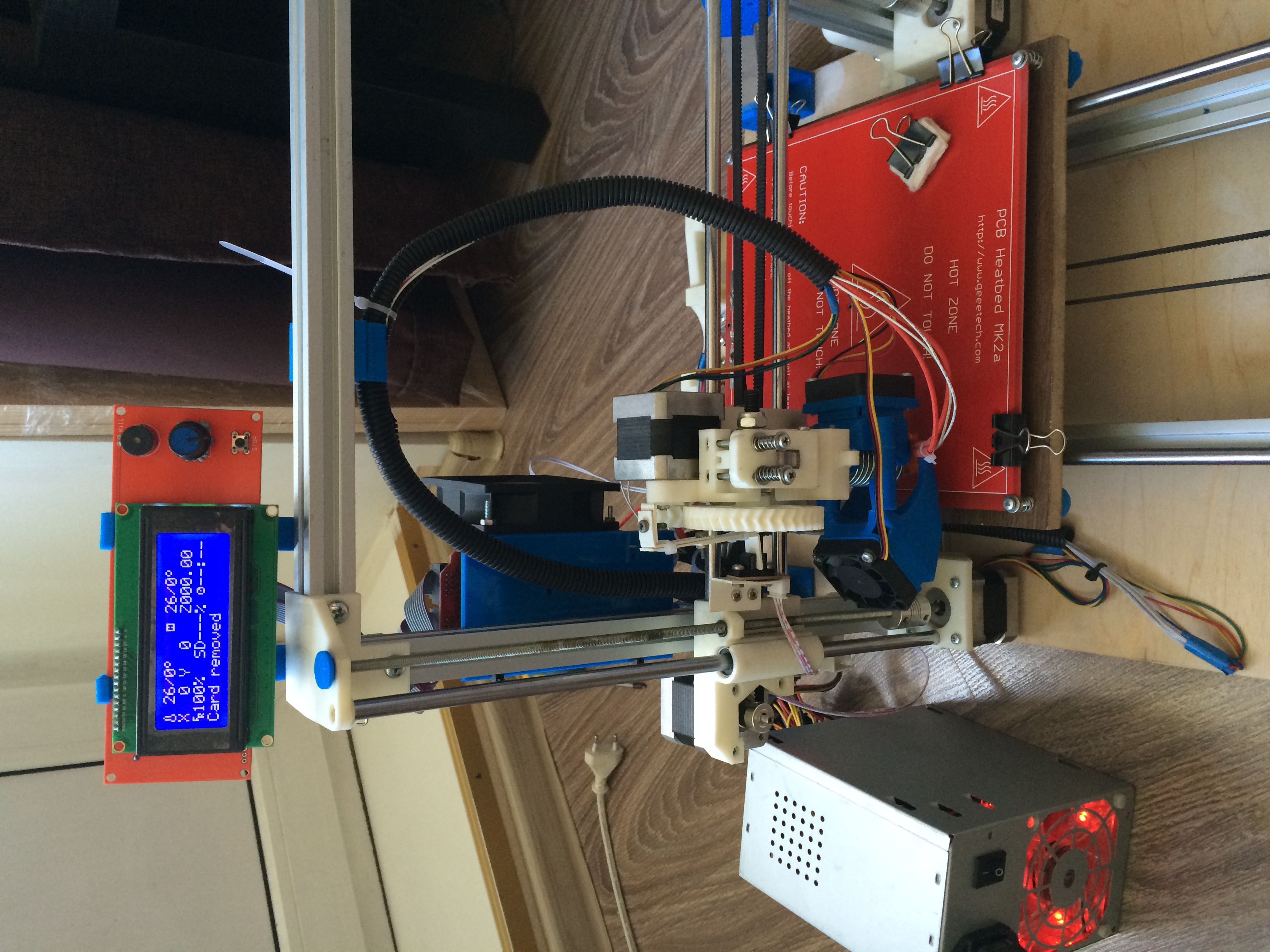 Принтер собран, в рабочем состоянии. Отпечатал на нем пол катушки синего ABS пластика. PLA так и не освоил, да и времени на сей агрегат нет.