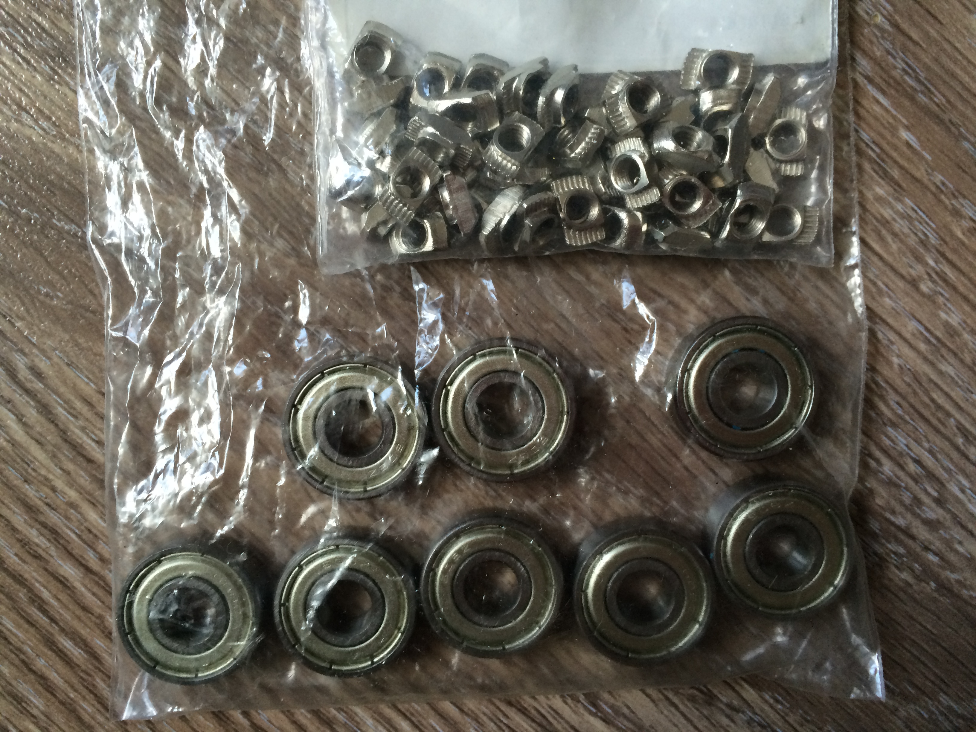 В комплекте сам принтер (комплект пластиковых деталей, направляющие, алюминиевый конструкционный профиль, 5 двигателей NEMA17 с крутящим моментом 4000, Mega 2560+ RAMPS 1.4, драйверы А4988, хотенд китайский клон e3d 5 версии, да и все по списку c reprap.org).