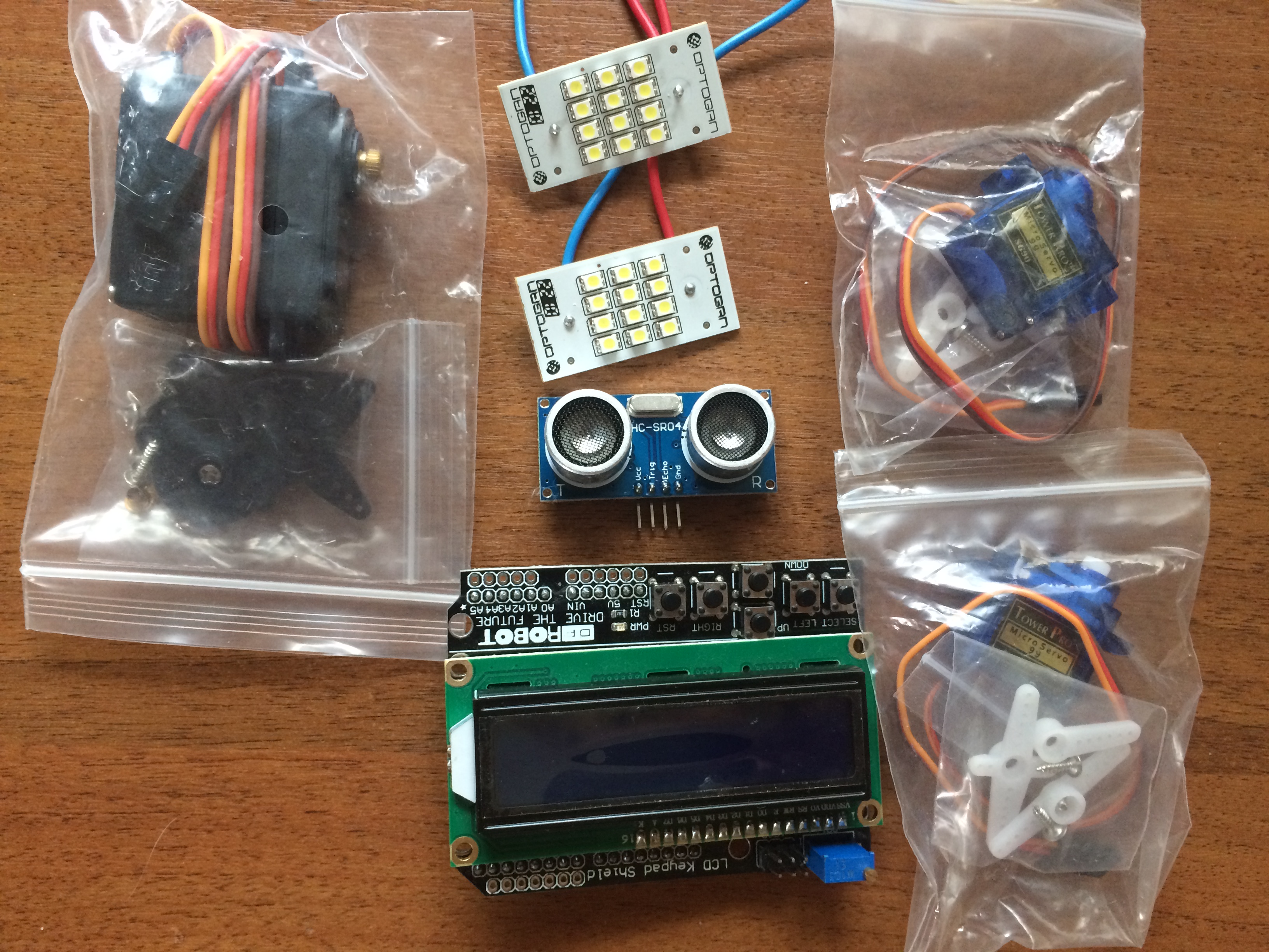 В дополнение к платформе добавится нетбук ASUS сустановренной операционкой и програмкой для управлением роботом, два сервопривода SG90, один сервопривод MG996r, ультрозвуковой датчик, два светодиодных фонаря, модуль с LCD дисплеем 16х2.