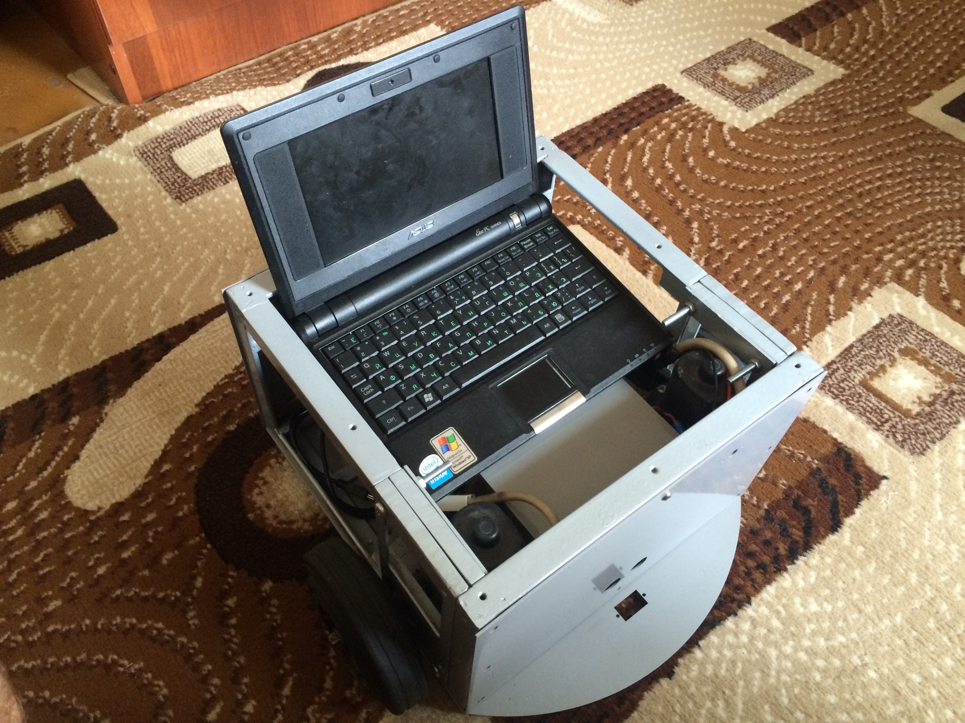 В дополнение к платформе добавится нетбук ASUS сустановренной операционкой и програмкой для управлением роботом, два сервопривода SG90, один сервопривод MG996r, ультрозвуковой датчик, два светодиодных фонаря, модуль с LCD дисплеем 16х2.