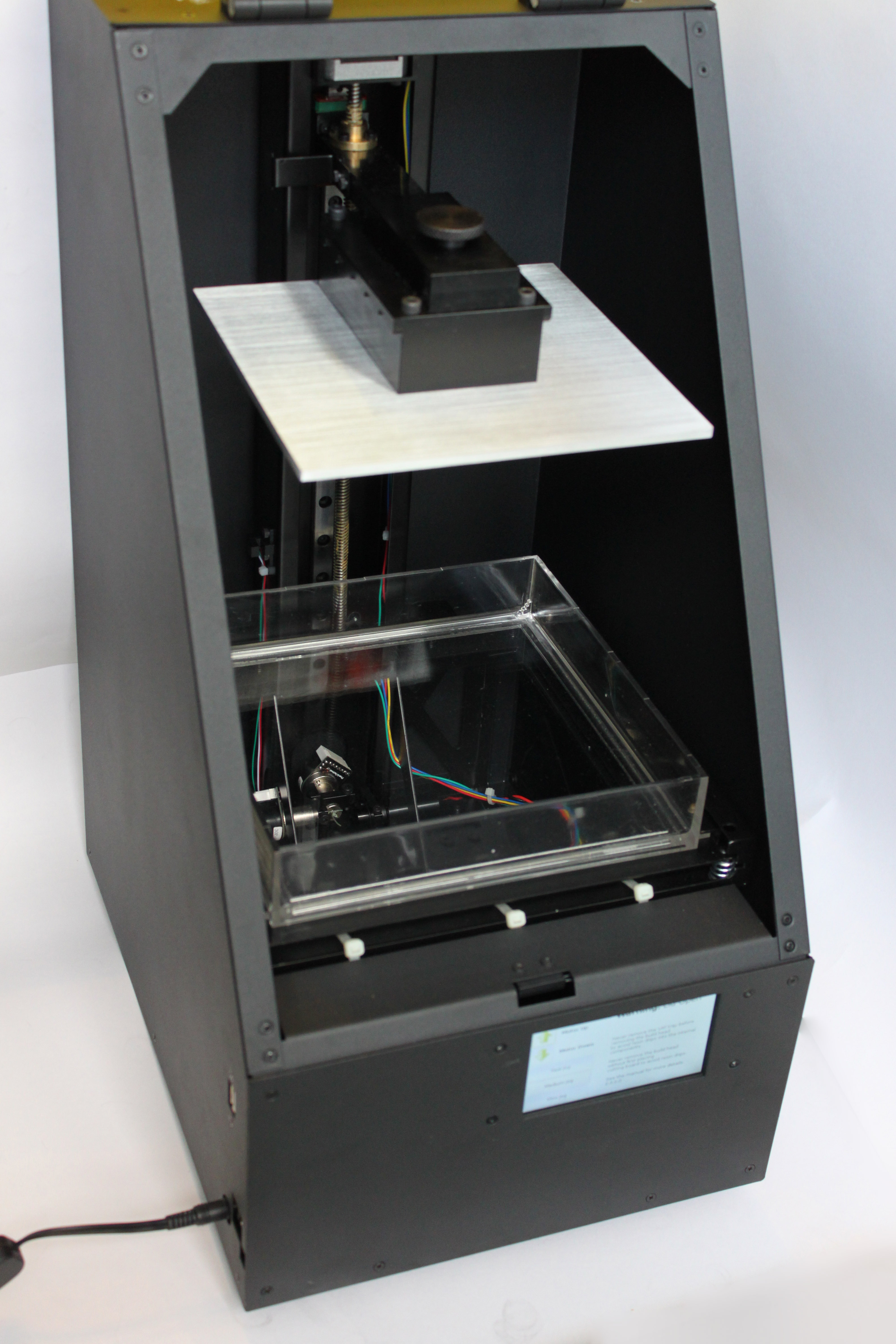 Был приобретен на Kickstarter. Пришёл из США через год после покупки без смолы - к тому времени интерес уже прошёл. Проверял, калибровал без фотополимера - всё рабочее. Можно приобрести у производителя Open Resin-лицензию и печатать любым фотополимером.