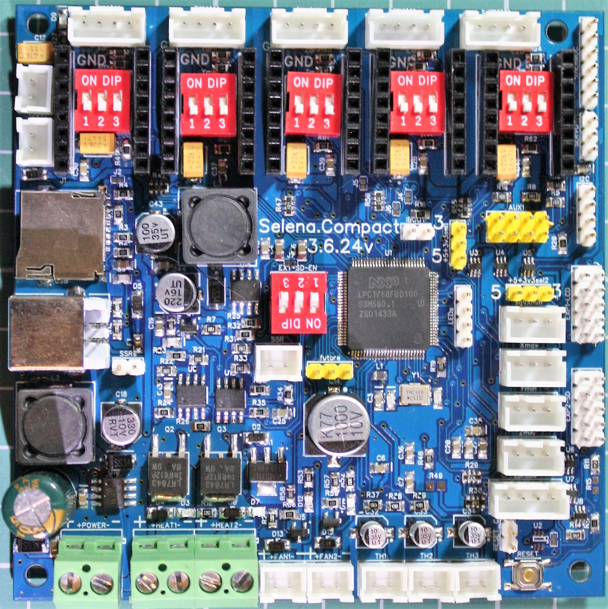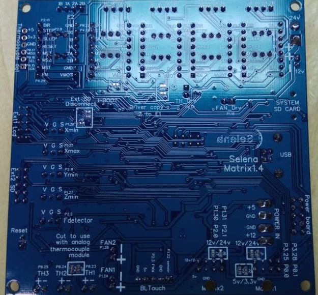Selena Matrix блок контроля• На плате разместились 5 сменных драйверов с независимым управлением, 4 разъема концевых выключателей, разъем сенсора прутка, 4 канала температурных сенсоров, 3 канала управления вентиляторами.