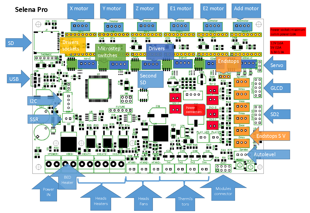 o Отдельные выводы для питания внешних устройств по 2 порта 3.3В, 5В, 12В. Суммарно нагрузка на всех портах не может превышать 0.6A