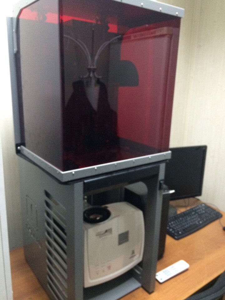 Принтер работает по технологии DLP, что позволяет выращивать изделия из фотополимера, работает с высокой точностью (высота слоя до 20 мкм).