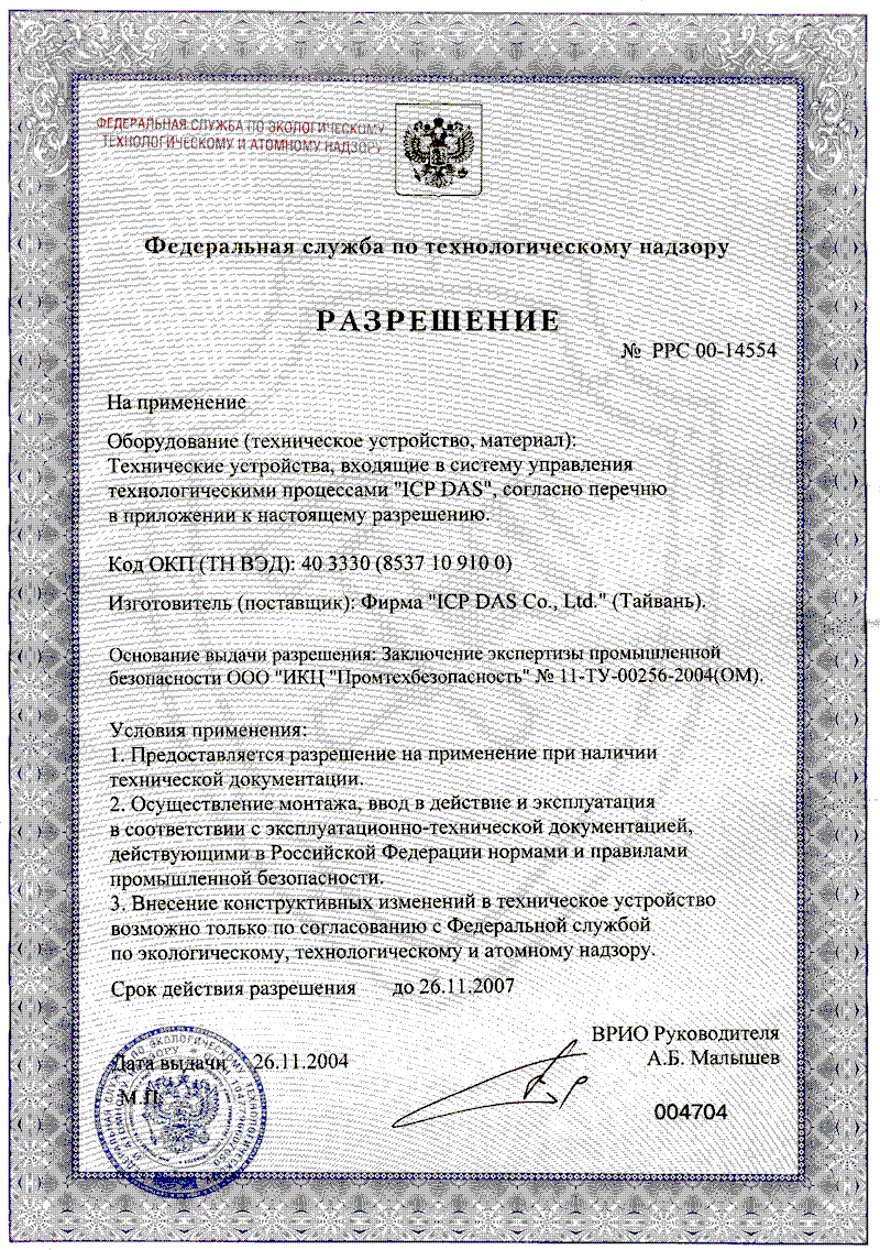 Имеет сертификат Федеральной службы по технологическому надзору на применение в системе управления технологическими процессами.
