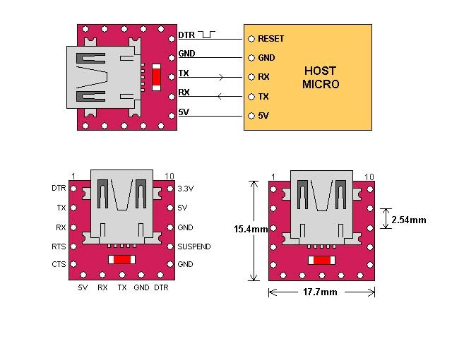 * Easy 5 pin interface to any host device: VCC, TX, RX, GND, RESET.