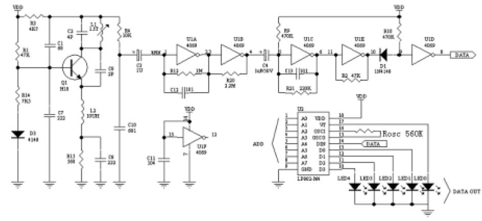 приёмник состоит из 2х частей собственно сам приёмник с инвертором tc4069 и микросхема раскодирования сигнала lp802-4m на которую можно повесить 5 нагрузок но используется только одна.