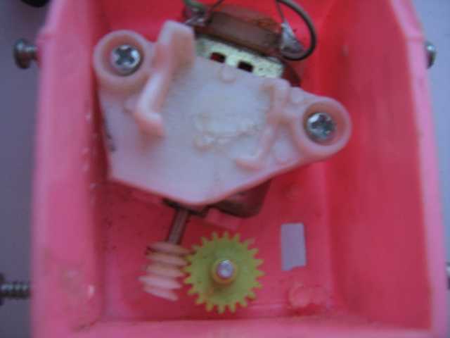 Как она выглядела, когда была колясочкой уже был сложно определить. Перед утилизацией у остатков колясочки под сиденьем была обнаружена коробочка, из которой торчал вниз заинтересовавший меня штырёк. Вооружившись отверткой удалось извлечь некоторое добро. Наиболее ценное - пьезопищалка и, внимание!, моторчик с червячной передачей! Передача, правда, пластмассовая, но сиварно приятно. :)