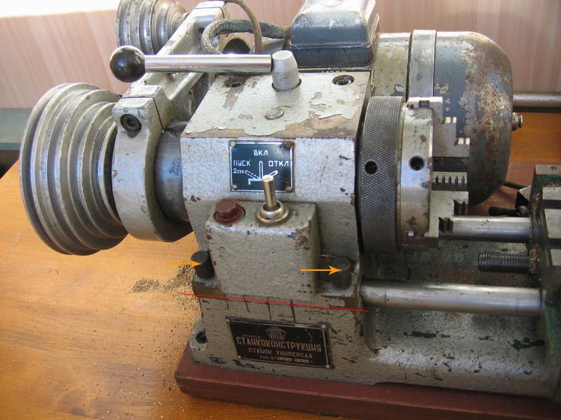 Нафига это не знаю, не применял - по красной линии весь блок передней бабки снимается (стрелочками показаны направляющие штифты), в центр образовавшейся площадки ставится труба, на которой с помошью переходника крепится передняя бабка