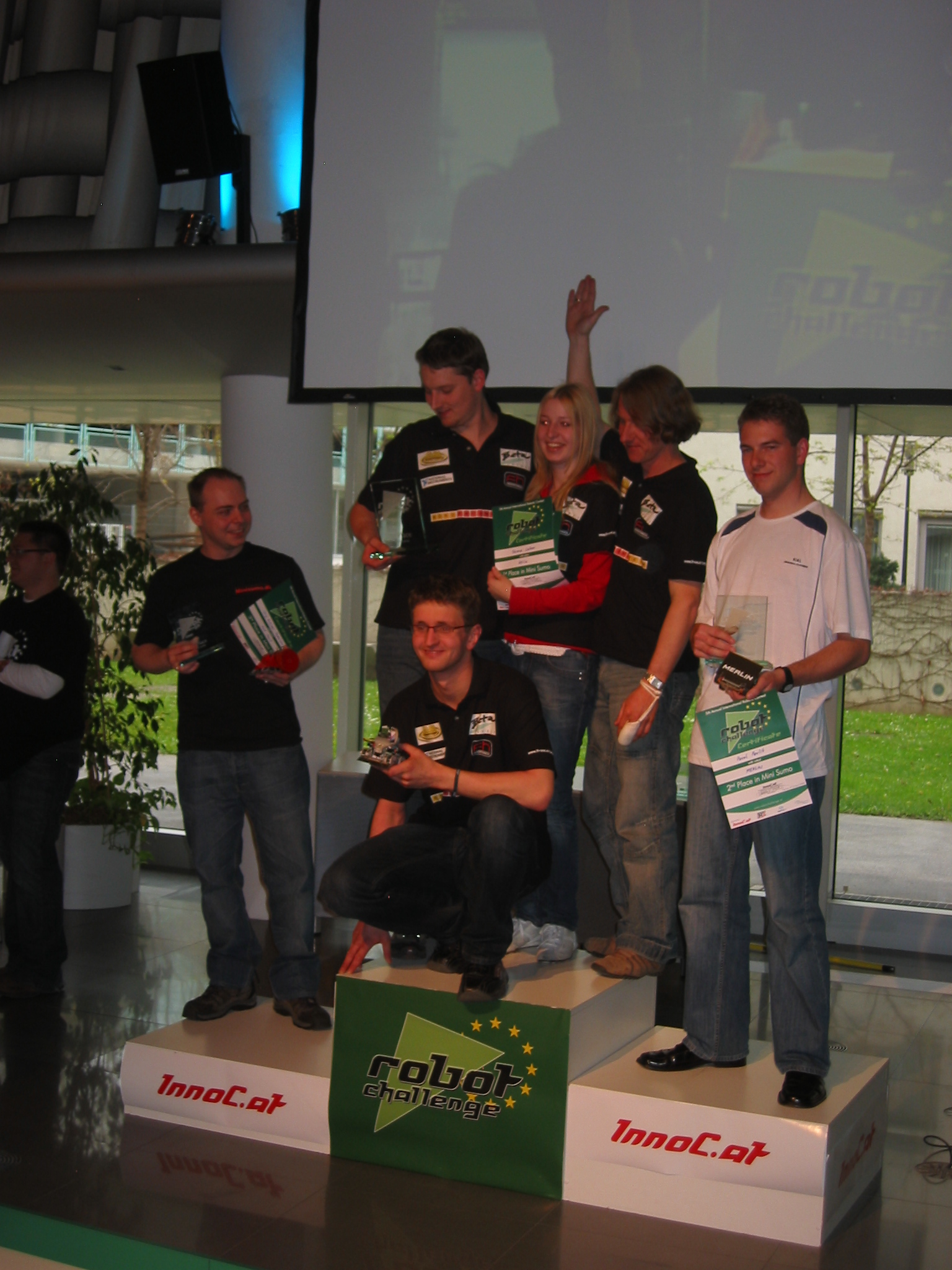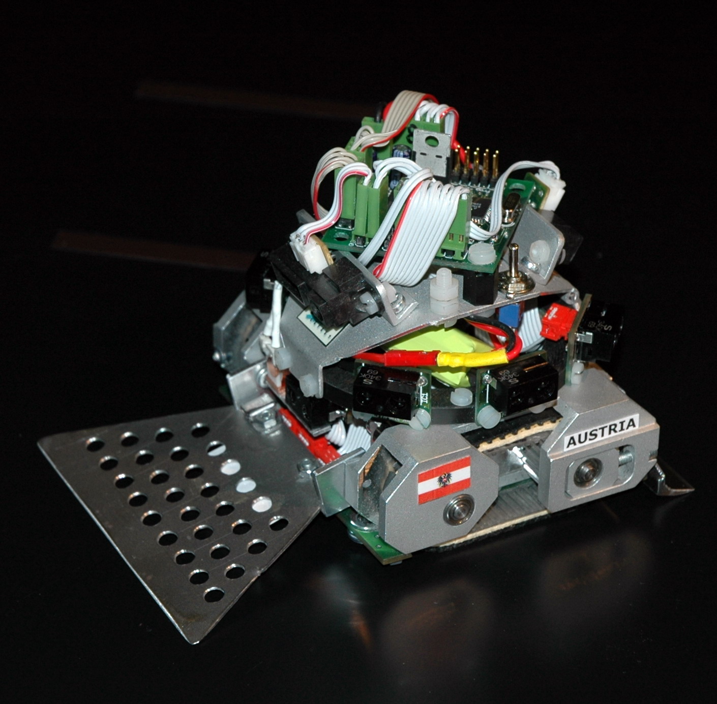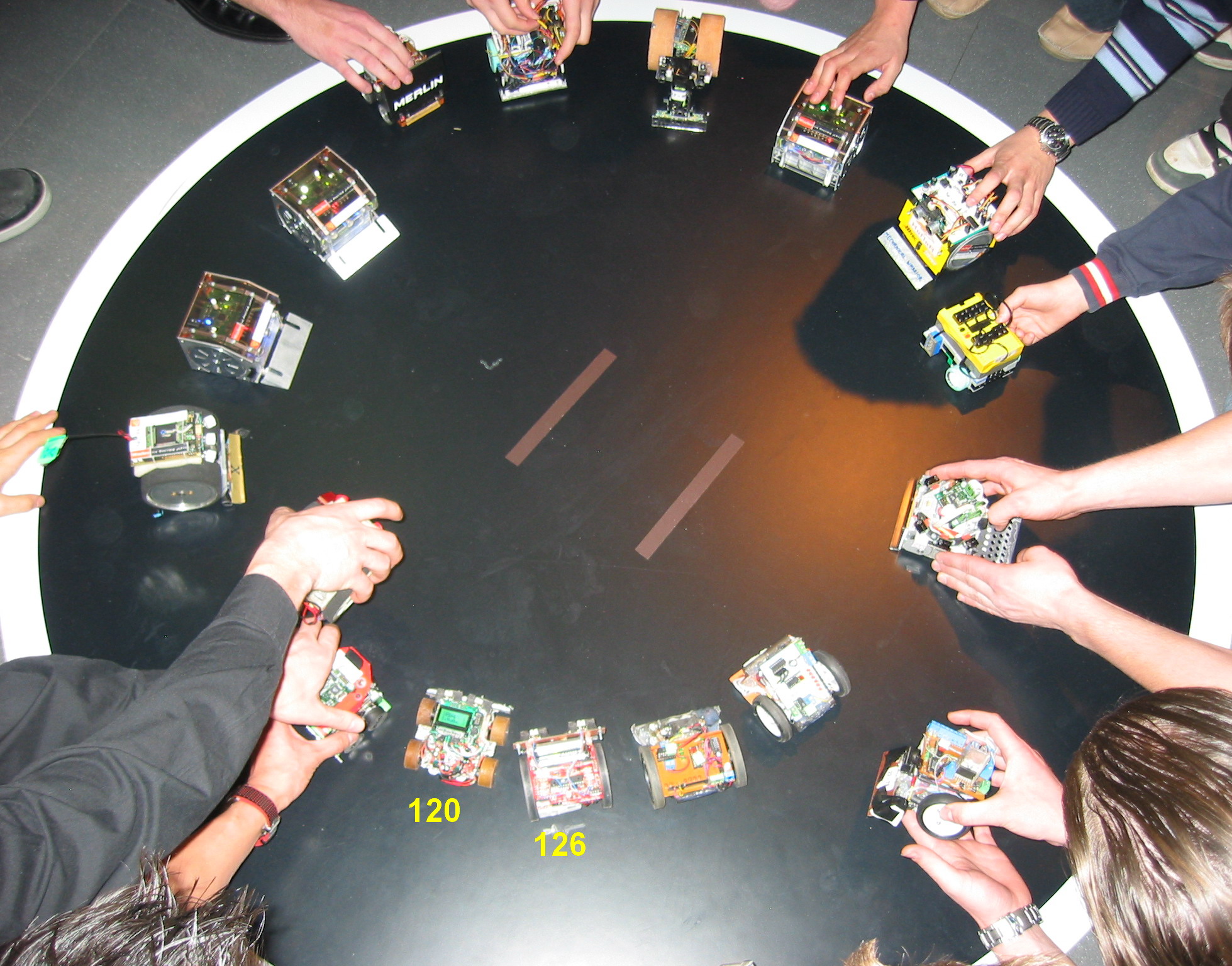 Участники были примерно из 10 стран: Австрия, почти вся восточная Европа, Дания, Англия, Британия, ну и Россия. Почему-то среди чехов было много слаломистов, среди поляков – сумоистов, а британцы отличились тупыми роботами в 3кг сумо без сенсоров (см ниже). Была одна очень сильная команда FH из Австрии (10 роботов, 1-е места в мини и микро сумо и простом слаломе)