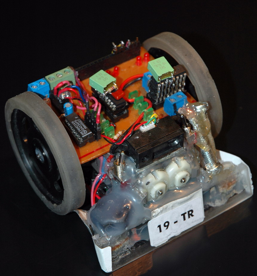 Роботы для мини-сумо были самые разнообразные. Часто заметно, что афтор увлекается какой-либо концепцией и пытается довести ее до совершенства, упуская многое остальное. Однако лучшие роботы были без очевидных слабых мест. Мой был самым быстрым, но полностью это преимущество не было реализовано из-за просчетов в тактике. «Темой года» были хорошо отточенные скребки. У чемпиона и занявшего 2е место они были к тому же откидными, так чтобы полностью подцепить соперника и лишить его опоры. Часто матч велся лоб-в-лоб и победа определялась остротой скребка, трением колес и крутящим моментом. Один из моих противников кстати так прямо задымился.