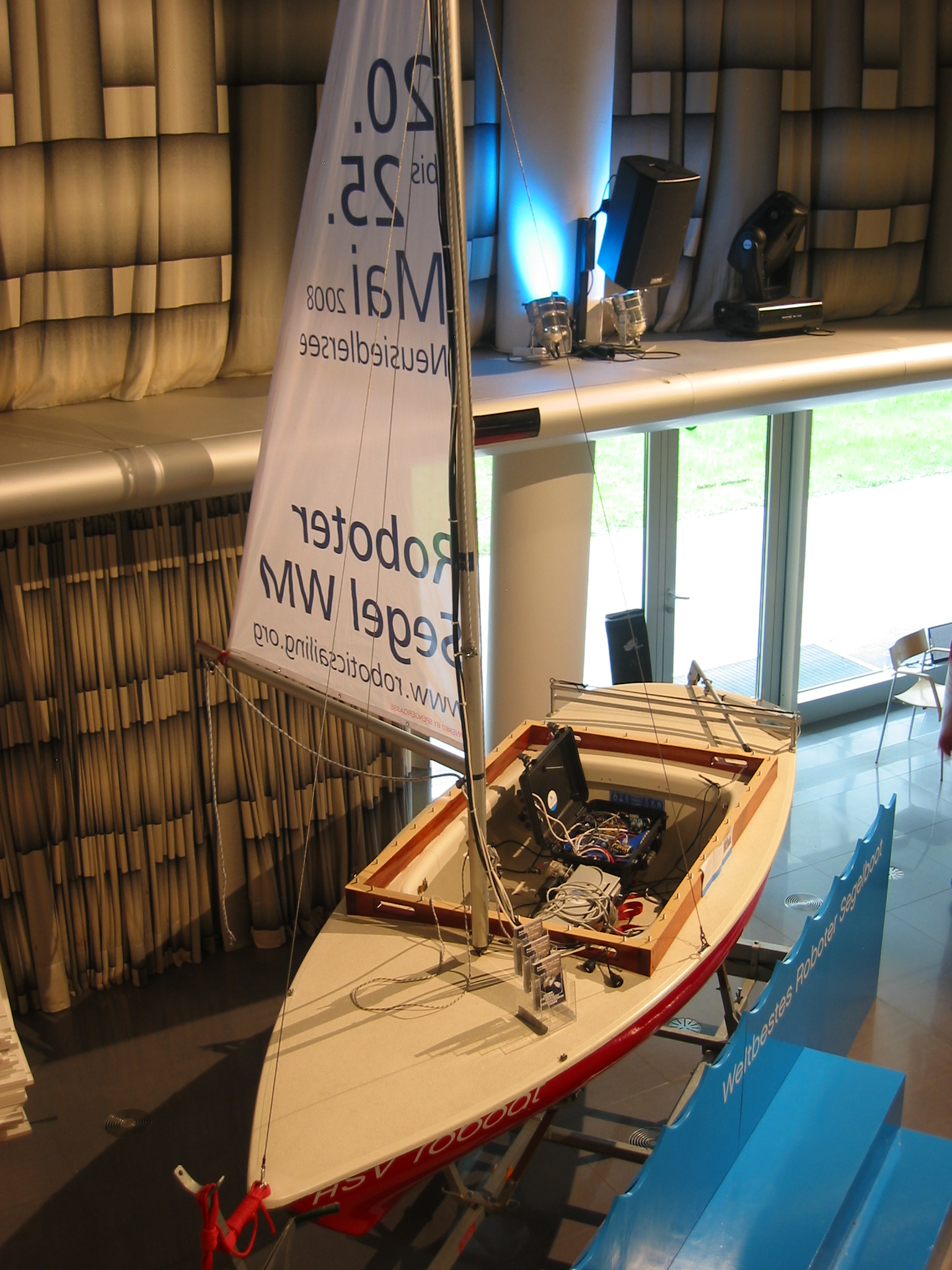 Специально для EdGulla - фото робота-яхты. Это-собственный преокт организаторов. Она, как говорят чемпион мира в своем классе. Даже может переплыть Атлантику. См. здесь: http://www.roboat.at/en/home/article/