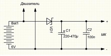 Из предложенных типов аккумуляторов рекомендую металлгидридные. Пишу на асемблере. Теории обычных ПИД регуляторов в сети полно, а вот именно для гоночной машинки - сам ничего не смог найти. Но форумчане помогли разобраться, там все просто. Рассказываю алгоритм ПД регулятора для лайнтрейса. Есть система координат (линейная), трасса всегда проходит через ноль. А робот (его центр) может находиться как на трассе (отклонение ноль), так и справа или слева от трассы. Для мнемонической простоты отклонения влево будем считать отрицательными, а вправо положительными. С каким-то периодом мы от датчиков получаем информацию: отклонение и знак. Нам нужно знать текущее отклонение Е1 и предыдущее отклонение Е2 (числа знаковые). Формула ПД регулятора получается такой: А = П*Е1 + Д*(Е1-Е2), где П - пропорциональный коэффициент, Д - дифференциальный коэффициент, А - разность скоростей колес (по знаку определяете какое должно крутиться на всю катушку, а какое должно крутиться медленнее). Казалось бы что это все, однако нет. Мы получили разность скоростей (причем затормаживающее колесо может в пределе на всю катушку крутиться в обратную сторону, если ваш лайнтрейсер это позволяет (а если хотите побеждать на нем, то должен позволять)), но нам надо на моторы выдать разный шим, а он со скоростью связан не линейно. То есть у вас должна быть таблица перевода скорости в параметр шим. Вот теперь все. Что делает коэффициент П? Он делает разность скоростей тем больше, чем дальше мы от линии. А что делает коэффициент Д? Он стремится увеличить разность скоростей, когда происходит уход с трассы, и уменьшаем разность скоростей когда происходит возврат на трассу. Из двух коэффициентов главный конечно П, сперва надо найти его. При малых П робот не успевает возвращаться на трассу при ее уходе, при больших дергается как сумашедший. Сперва ищем приемлимое значение П, при котором робот не теряет трассу, затем улучшаем динамику коэффициентом Д (при этом нужно уменьшать и П, поскольку работа несколько перераспределяется между коэффициентами). И еще одно пояснение, которое я сам долго не мог понять. Как так, аргумент у нас в единицах длины (мм, дискреты, попугаи), а функция выдает даже не скорость, а разность скоростей двух моторов. Мне это объясняли, но сейчас я нужных слов не найду, просто поверьте в это (или докопайтесь до истины и всем расскажите в этой ветке). Когда едем по прямой и прямо по трассе, то Е1 и Е2 равны нулю, А равно нулю, оба движка включены на всю катушку. И последний нюанс - когда происходит потеря линии (для робота это максимально возможное отклонение) - тогда разность скоростей максимальна (одно колесо полный вперед, второе полный назад). То есть разность скоростей, выдаваемых функцией, должна быть ограничена. Ну вроде основное рассказал, если что забыл или не ясно - спрашивайте.