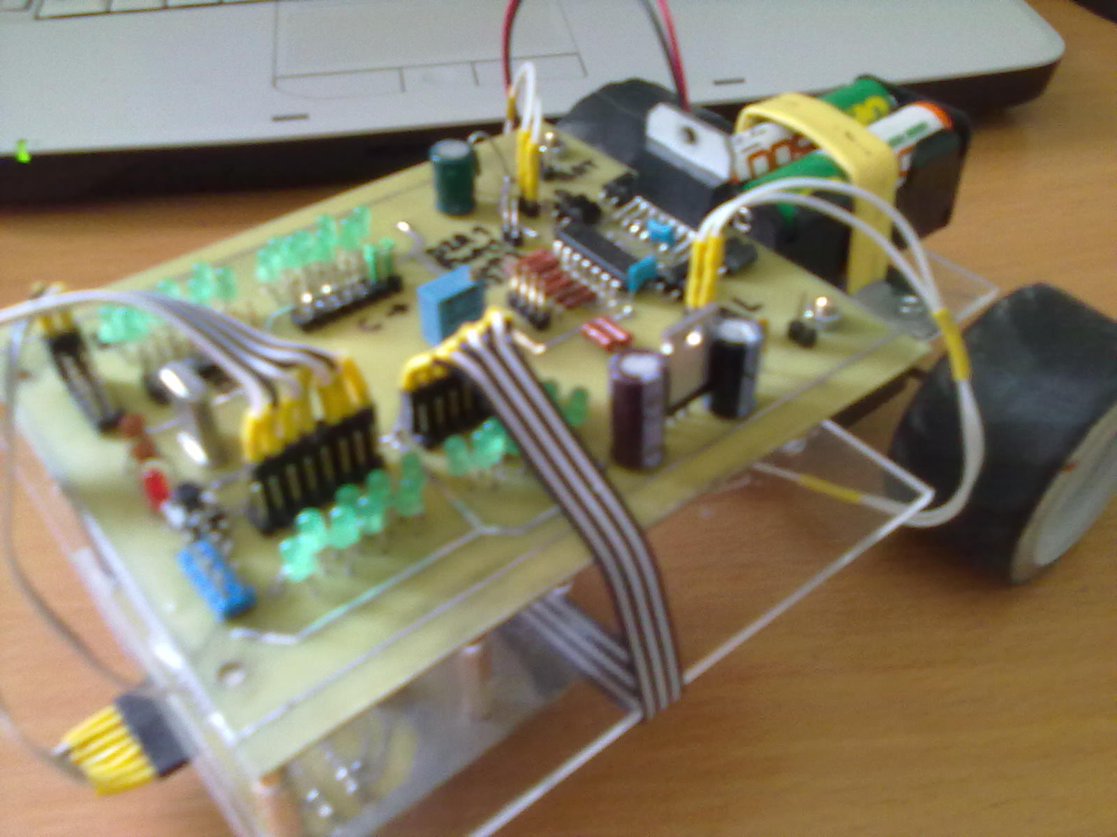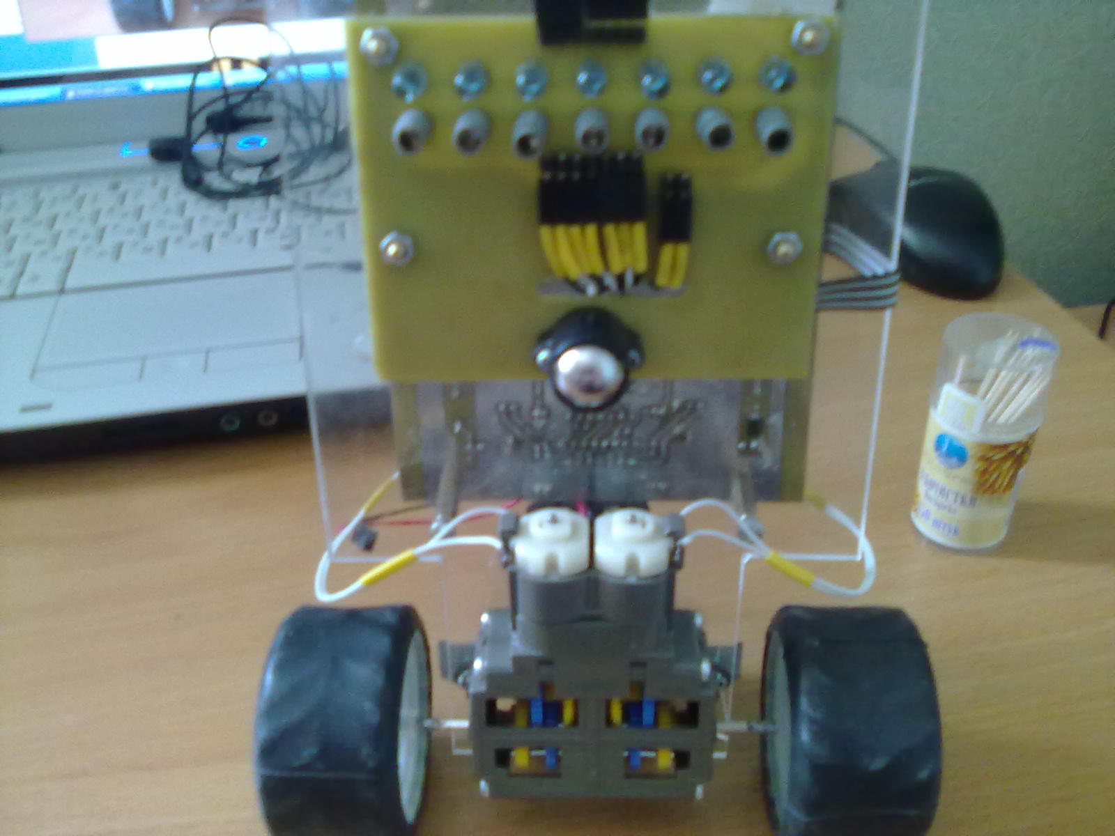 Значит задача такая: узнать от датчиков, где находится центр робота относительно центра линии (шириной 20 мм). Пляшем от датчиков (чаще всего это отражательные оптроны). Есть два способа их использования: в цифровом и аналоговом режиме. Для цифрового режима характерно использование компараторов и подстроечных резисторов (для подстройки датчиков), сигнал выходит черное/белое. Соответственно таких датчиков должно быть много, расположенных с определенным шагом (шаг 10 мм дает разрешение 5 мм). 5 датчиков дадут рабочий диапазон +-20 мм от центра. Хорошо это или плохо? Робот должен ехать по линии, срезать неспортивно (хотя ненадолго покидать линию можно), а значит много датчиков не надо, но при этом шаг отклонения будет большим, что сведет на нет все преимущества ПД регулятора. Гораздо интереснее аналоговые датчики, их и рассмотрим. Там уже не нужны компараторы и подстроечники, но нужен АЦП с несколькими входами. И АЦП должен работать достаточно быстро, поэтому не увлекайтесь с числом датчиков. В аналоговом режиме число датчиков может быть от одного и выше. Если датчик один, то он настраивается на границу линии. Половина пятна темная, половина светлая, код ацп примерно равен половине диапазона. Смещаемся - код ползет. Тут разрешение гораздо выше, нужно только успевать измерять АЦП и не терять линию. А потерять ее легко: сначала перескакиваем на другой край линии, а затем сходим с ума. Поэтому гораздо круче два аналоговых датчика, смотрящие на края линии. Результатом отклонения будет разность показаний - если ноль - мы четко по центру линии. Тут перескоков можно не бояться. Этого количества датчиков уже достаточно для нормального гонщика. Но можно поставить и больше, и подальше от пола. Тогда с каждого датчика придет свой аналоговый сигнал, совокупность которых можно интерпретировать как кадр положения линии. Эту информацию можно математически обработать (гуглим по словам "средневзвешенное, центр масс" или что-то такое), короче получить "субпиксельное разрешение", не забыв при этом отрезать шумы. Ну вот, информация от датчиков получена, осталось перевести ее в отклонение. Это легко, если знать где физически находятся датчики. Вот как-то так...
