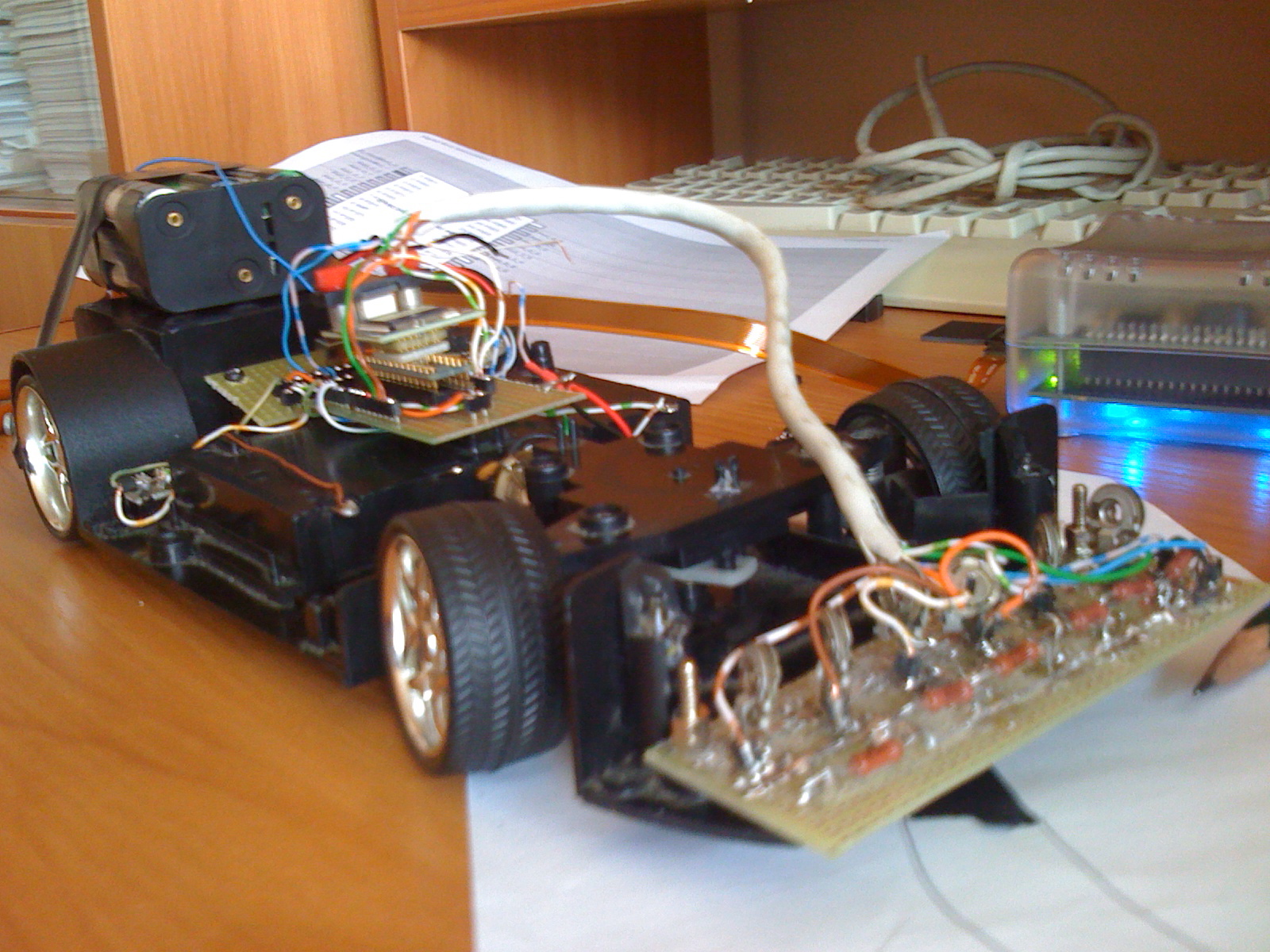 Итак. Началось все в мае 2010 года, когда я учился на 5 курсе. Задумала кафедра ЭОМ города Тернополя (Украина) провести гонки роботов. Тип соревнований и трасса отличались от стандартных - это был видоизмененный linefollowing. Трасса замкнутая, с 5 черными линиями (2см) и белыми просветами (5см) + борты по краях. Интерес в том, что все роботы ездили одновременно. Соревнования намечались на июнь, соответсвенно у нас было 3 месяца и нулевой опыт (не считая мигания светодиодами с контроллера на лабораторных).