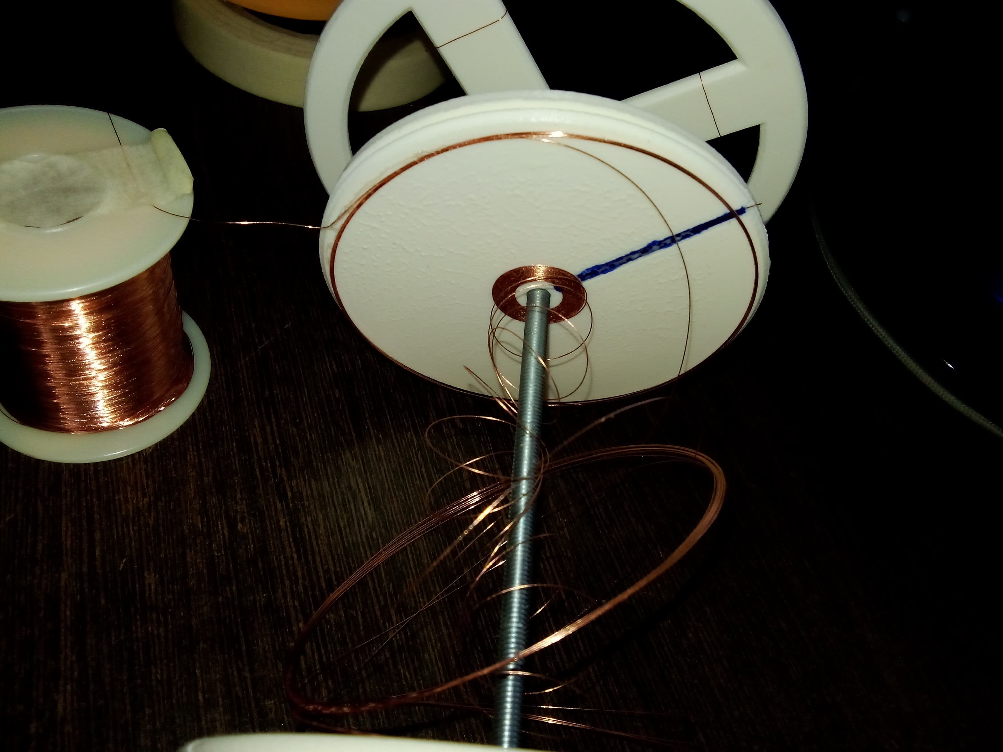 Проволоку внутри желобка на блине закрепляю с помощью радиотехнического быстросохнущего лака и малярного скотча, которым по бокам проклеиваю желобок перед нанесением, дальше наношу лак для фиксации, жду 10 минут, чтоб он застыл, снова клею малярный скотч по краям, прохожу вторым слоем лака для верности, чтоб проволоку при начале намотки усилием не вырвало из желобка.