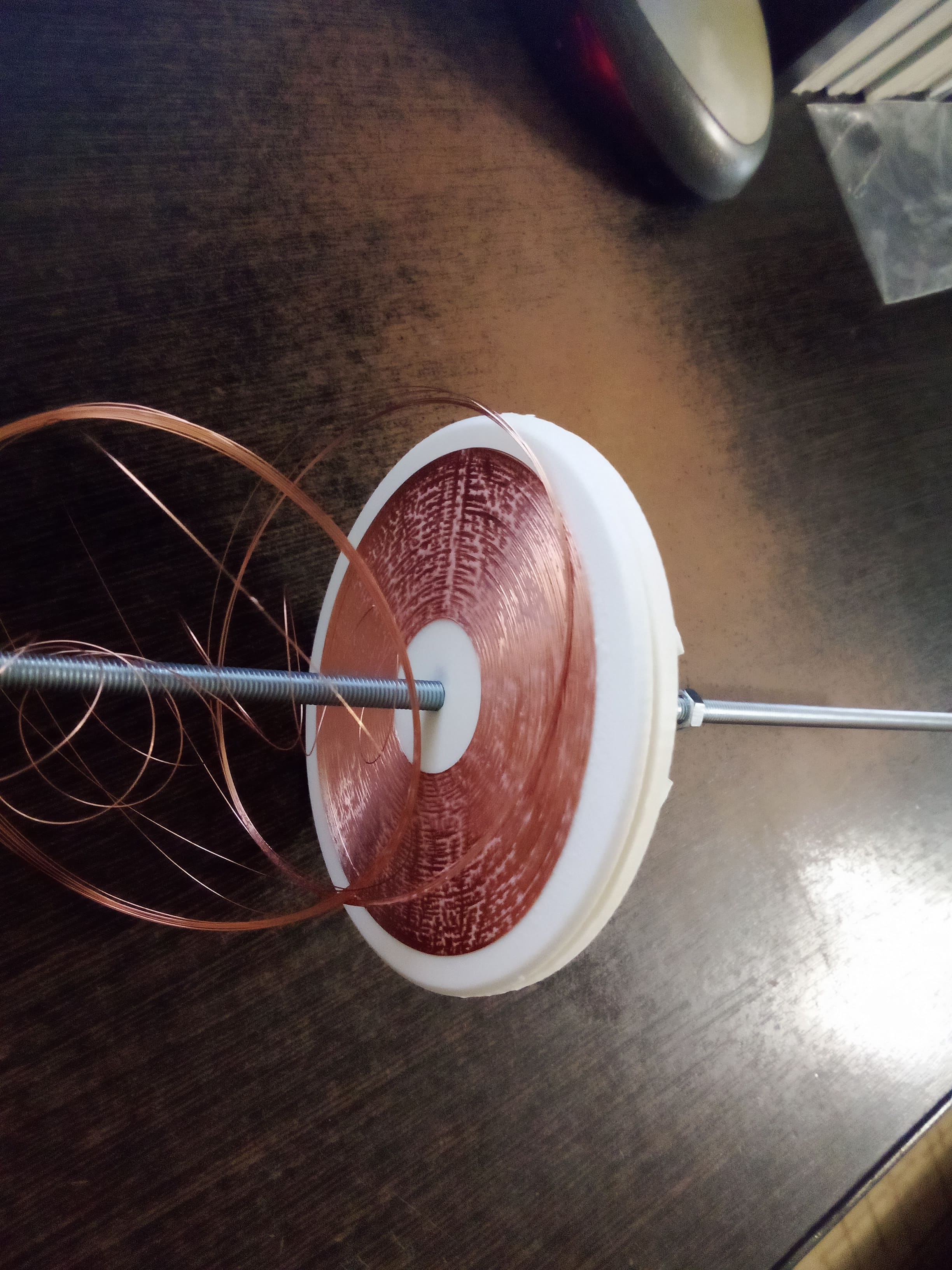 Кажется понял(раза с четвертого, как обратно проволоку на катушку очищал и сматывал) в чем у меня дело и почему проволока постоянно липнет к верхнему блину. Дело в том, что низ верхнего блина всегда гладкий и ровный, в отличии от верха нижнего блина из-за особенностей печати, в связи с чем когда спираль с клеем наматывается и начинает засыхать у этой самой спирали с низом верхнего блина получается эффект присоски когда я блины разъединяю, и она естественно по большей части прилипает к верхнему блину и лишь небольшая часть остается внизу, т.к. оттуда просто проволока идет, которая и не дает ей всей уйти наверх.