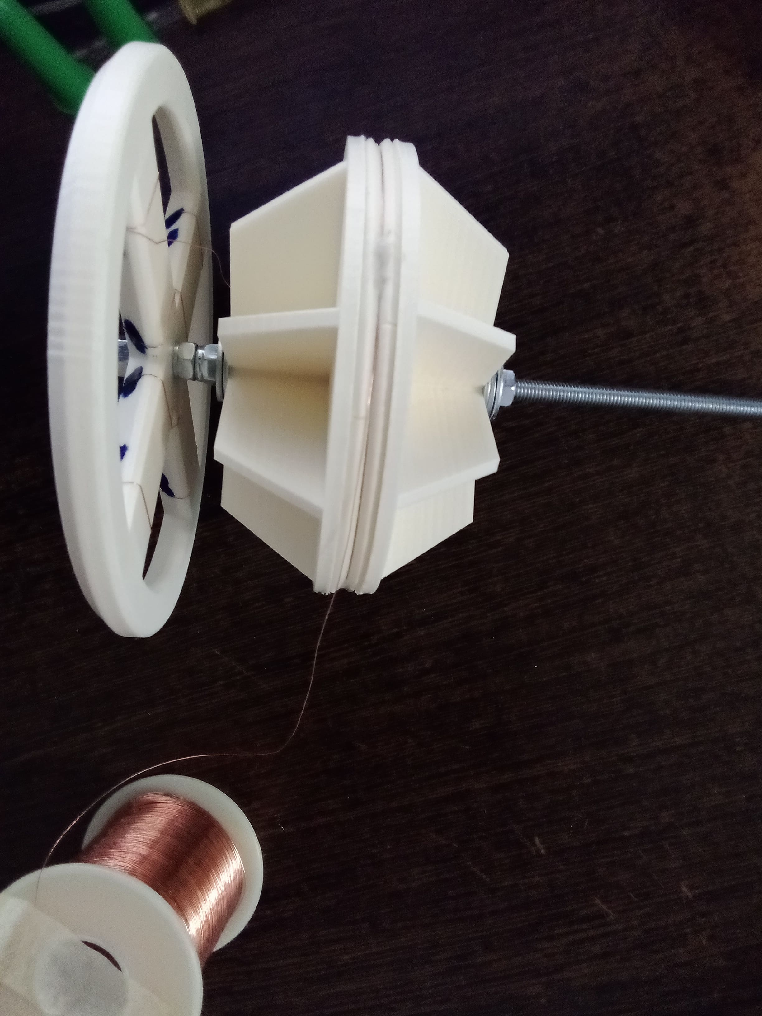 так чтоб они соприкасались друг с другом выпуклыми частями и обеспечивали уменьшение трения при намотке, чтоб если нужно шпилька с гайкой прокручивались по ним и гайка не раскручивалась. Гайку использую всего одну, закручиваю пальцами на сколько хватает усилия моей руки, после чего лишь слегка подтягиваю на пол оборота, чтоб она не раскрутилась и этого хватает. Дальше просто ложу себе на колени катушку с проволокой и с натяжкой наматываю спираль, получается 180 витков проволокой 0,2мм.