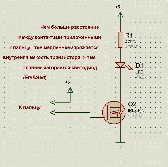 Сегодня хотел экспериментально проверить можно ли включить полевик IRLZ44N от 5 В при входном токе всего 10 мА (выход контроллера), когда собрал схем во время эксперимента случайно получилось так что на палец попал контакт от затвора и недалеко от этого места я коснулся +5 В, и на мое удивление светодиод (от семисегментного индикатора) плавно начал включаться, и чем дальш точки соприкосновения затвора и +5 В на моем пальце - тем плавнее загорается светодиод.
