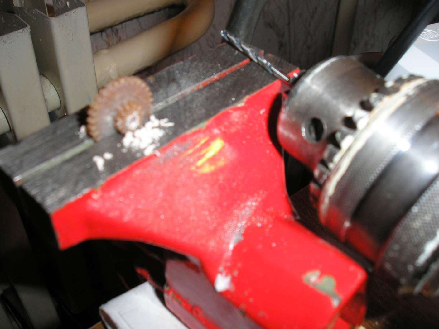 Закрепил шестерню в тисках, и просверлил, уже в намеченное отверстие – получил дырку:
