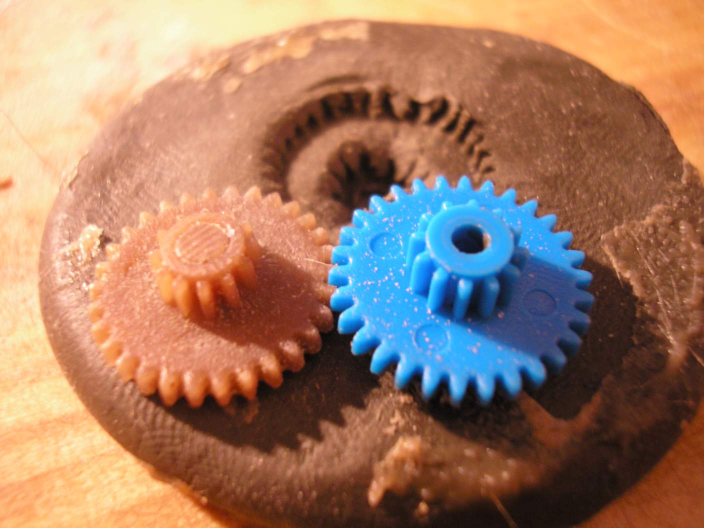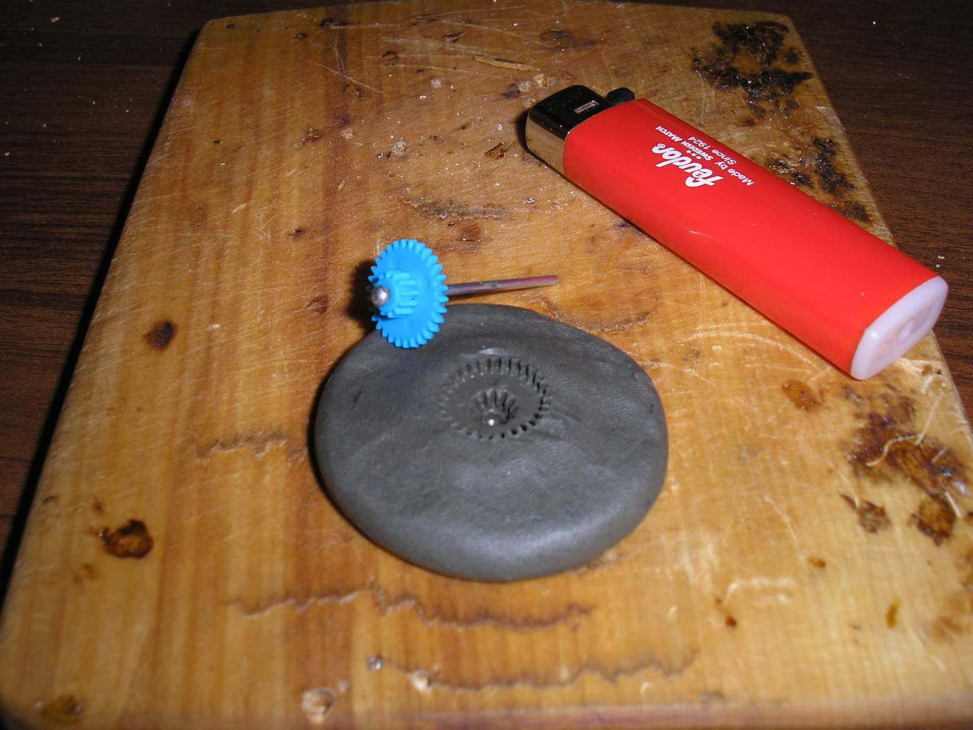 Тут первая трудность: шестерня утапливается не равномерно, один край все время глубже. Плюс к тому шаг зубьев маленький и пластилин во многие не попадает, пришлось аккуратно с боков шестерни поддавить пластилин так, что бы он проник меж зубьев. Более или менее залепить шестеренку удалось с 5-ой попытки – каждый раз блин делал заново. Вот что получилось: