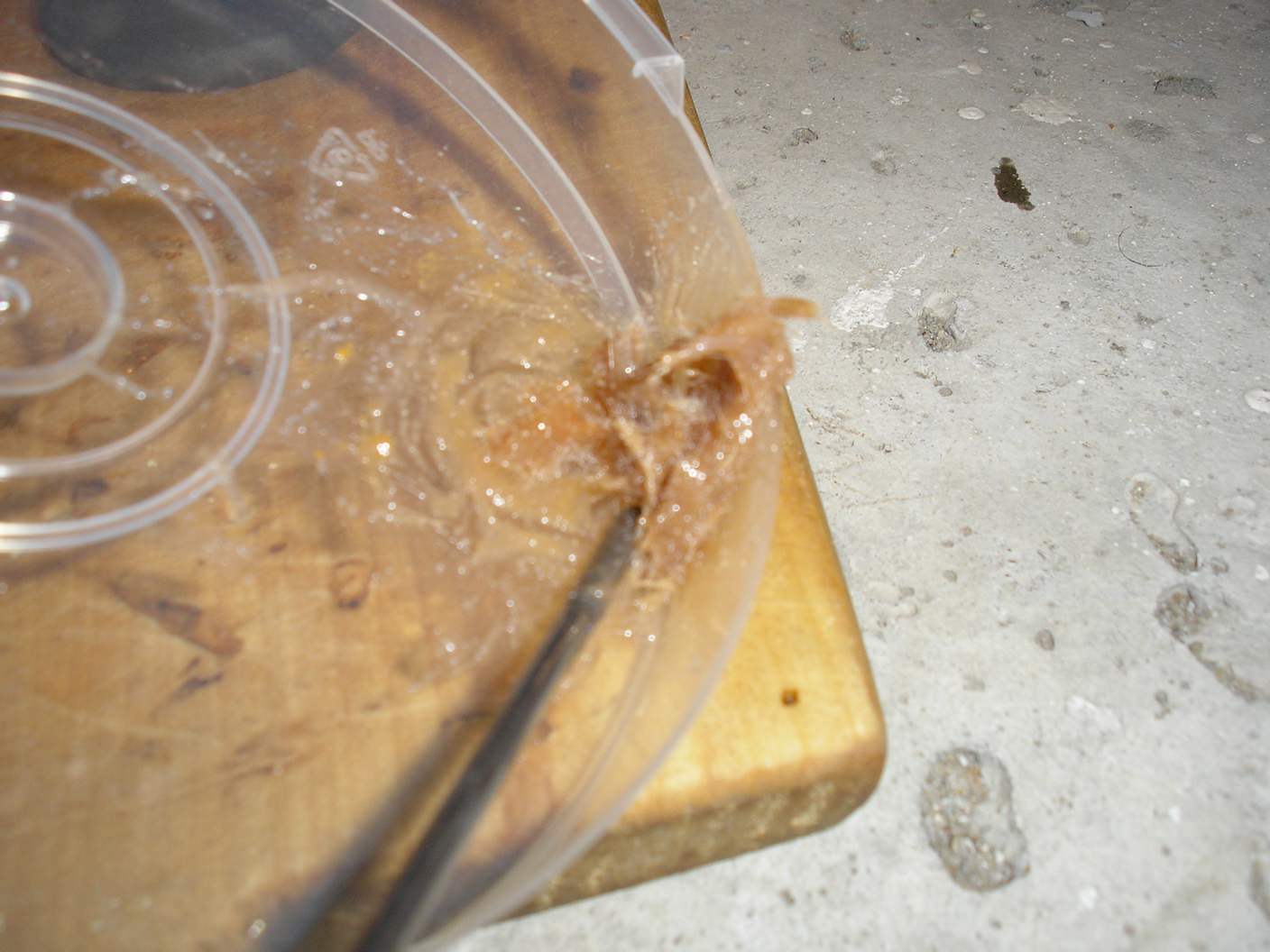 На банке написано, что очень опасная смесь – раздражает кожу, поэтому я взял в аптечке перчатки. Открыл большую крышку, а там еще и маленькая баночка – вернулся к надписям на упаковке и заметил слово «двухкомпонентная» - это означает, что перед использованием смешать содержимое обеих баночек. Пропорции нигде не написаны, наверное, имеется в виду, что использовать надо все сразу, но мне это расточительство не по карману – смешаю на глаз. Для смешивания тару я не нашел, пришлось использовать бокс от дисков.