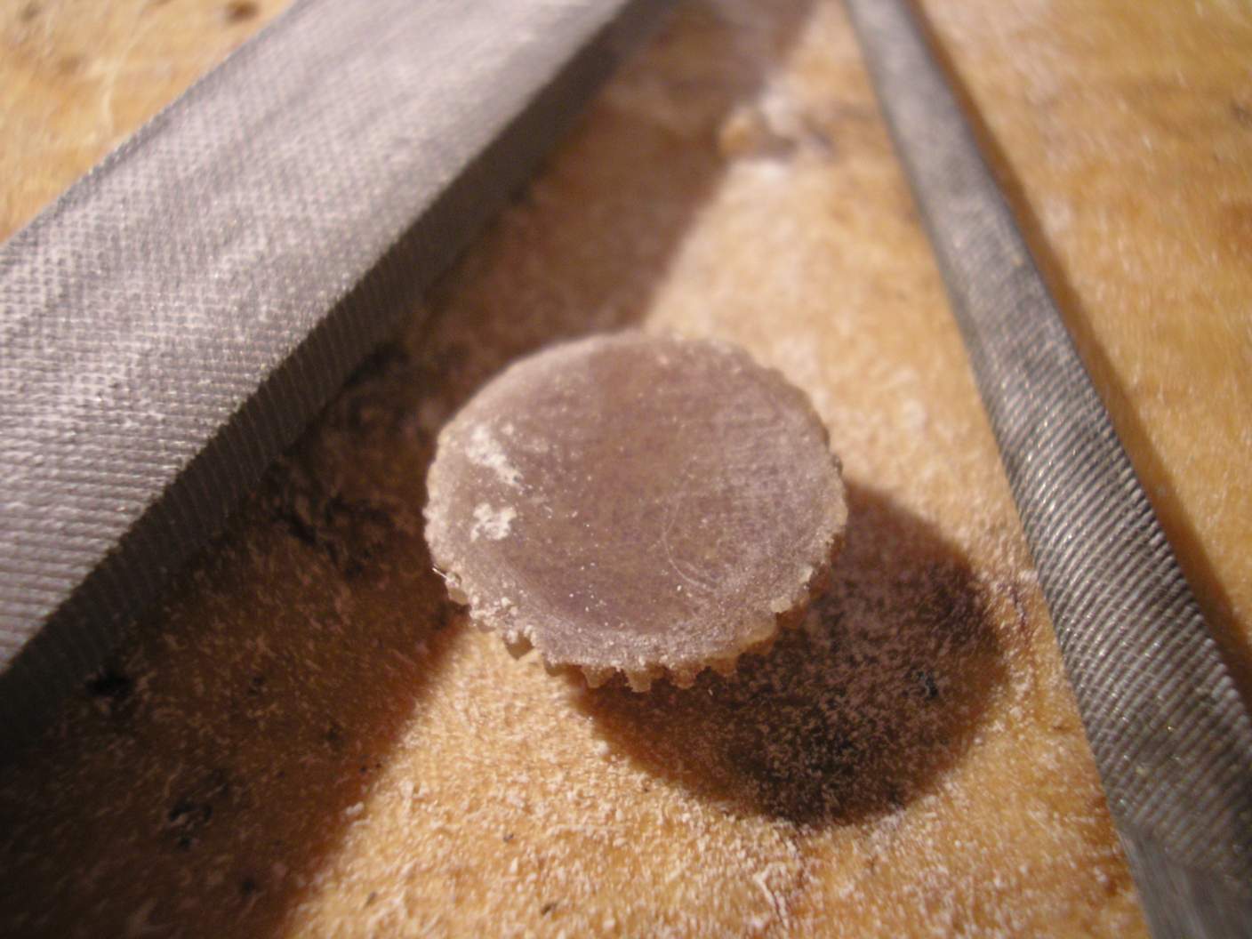 Аккуратно плоскогубцами взял за шпильку и потянул строго вверх… как и следовало ожидать, рука дрогнула, и края шестерни испортились. Заново слепил блин и уже опытной рукой с первой попытки влепил шестерню в пластилин. Теперь двумя руками с максимальной осторожностью вынул, и вот что получилось: