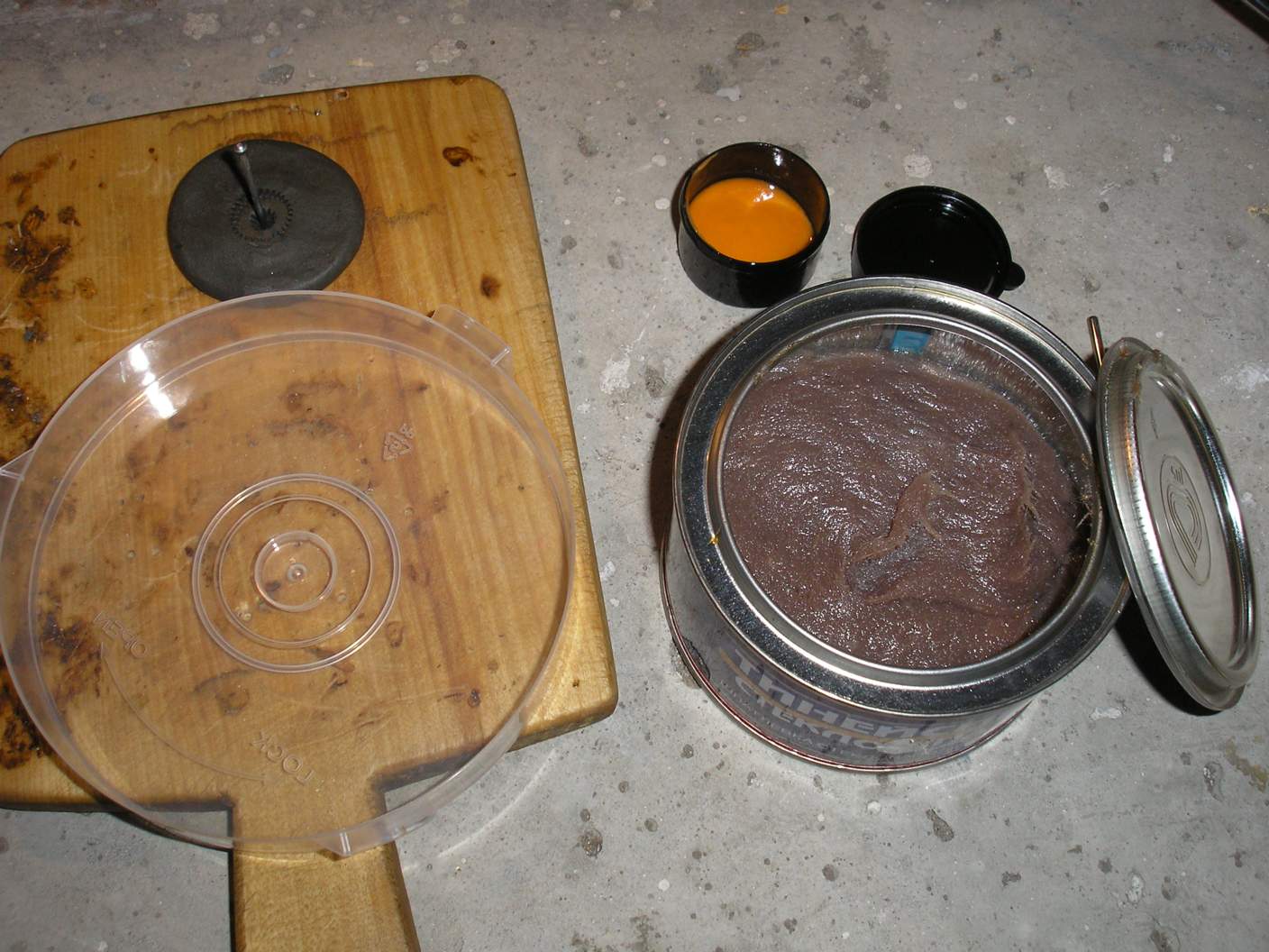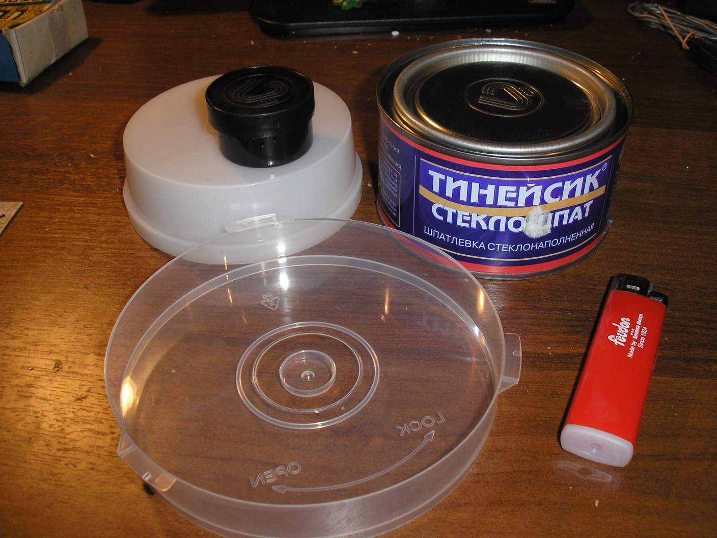 На банке написано, что очень опасная смесь – раздражает кожу, поэтому я взял в аптечке перчатки. Открыл большую крышку, а там еще и маленькая баночка – вернулся к надписям на упаковке и заметил слово «двухкомпонентная» - это означает, что перед использованием смешать содержимое обеих баночек. Пропорции нигде не написаны, наверное, имеется в виду, что использовать надо все сразу, но мне это расточительство не по карману – смешаю на глаз. Для смешивания тару я не нашел, пришлось использовать бокс от дисков.
