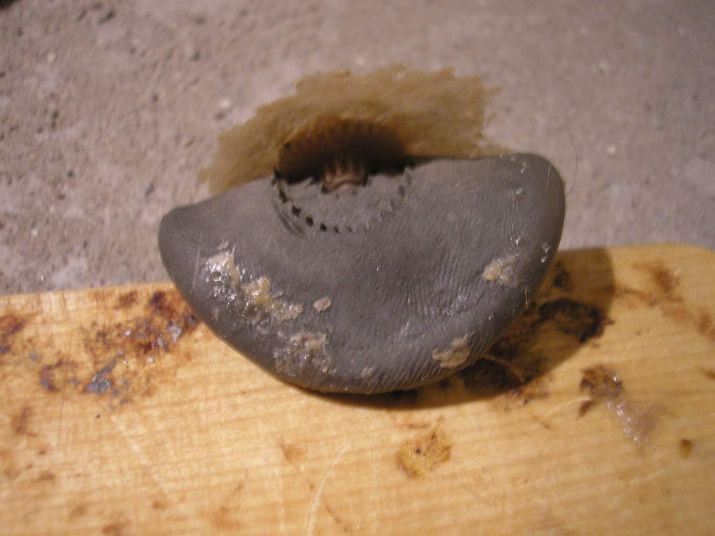 Тут первая трудность: шестерня утапливается не равномерно, один край все время глубже. Плюс к тому шаг зубьев маленький и пластилин во многие не попадает, пришлось аккуратно с боков шестерни поддавить пластилин так, что бы он проник меж зубьев. Более или менее залепить шестеренку удалось с 5-ой попытки – каждый раз блин делал заново. Вот что получилось: