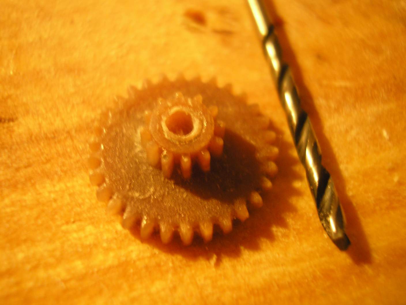Просто замечательно! Осталась последняя мелочь, которая может пустить всю работу под откос – отверстие. Оно должно быть идеальным центром шестерни и под идеальным углом. Тут нужен станочек – закрепил шестеренку, навел лазерный прицел и просверлил, но у меня нет такого станка, у меня есть руки. Взял маленькое сверло (диаметром 1.5 мм), руками приставил его к центру (где должна быть дырка) и помаленьку прокрутил сверло. Удивительно легко и просто сверло вошло в материал и сделало насечку – но не по центру – руки кривые. Маленьким ножичком и тем же сверлом я сместил дырку к центру, немного увеличив диаметр отверстия. Я заведомо брал сверло меньшего диаметра чем требуется именно на случай промаха.