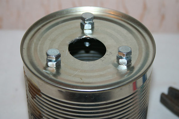 1. Печь - консервная банка диаметром 100мм. Внизу отверстие для входа пламени, тигель стоит на трех китах болтах внутри банки, в 20мм от дна (рис.1). Пламя должно обтекать тигель, создавая термовоздушную подушку - таким образом решается проблема №1: колоссальные теплопотери излучением и конвекцией при нагреве горелкой открытого тигля.
