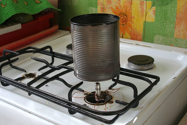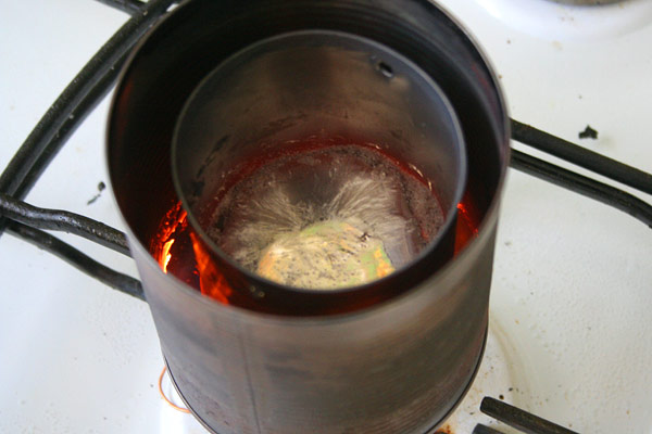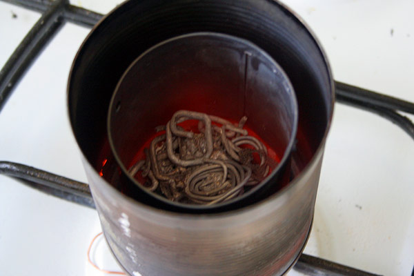 2. Тигель - консервная банка диаметром 70мм. Тигель обязательно закрывается крышкой для снижения теплопотерь. Есть риск прогорания дна, поэтому под рукой вода и песок, на плиту налита вода (параллельно предохраняя плиту от перегрева). Тигель больше греется с краев, риск прогорания центра минимален.