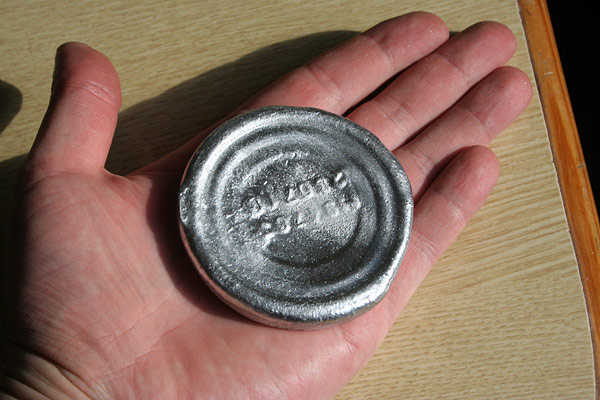 Тигель до красного цвета разогревается мгновенно. Добавляю алюминий (провод), закрываю крышкой - начинается плавление (рис.4). Металл плавится, шлаки всплывают и/или оседают на дно. По соображениям безопасности процесс не оставляется без внимания ни на минуту. Металл добавляется частями каждые 5 минут. В общей сложности ушло минут 20 (можно быстрее, дольше провозился с непривычки). Затем добавляю соль, удаляю шлаки, и - вуаля! Отличный жидкий металл (рис.5), пригодный для литья небольших изделий. Металл отливается в консервную банку, получаем слиток весом около 100г (рис.6). Задача решена!