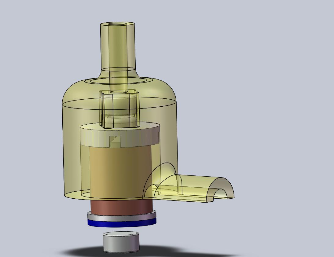 В центре катушка, серый циллиндрик сверху и снизу - неодимовый магнит диаметром 3 мм, он и будет пятачком. Сверху кусочек трубки со скруглённым торцом - то самое колечко, о котором говорил выше. Это одна цельная деталь с серым циллиндром, в который вставлена катушка. Должен быть сделан из жёсткого силикона. Принцип действия всей конструкции как в бесколлекторном двигателе - при подаче положительного напряжения, отталкивается верхний магнит, при реверсе нижний. Пружины не нужны, оба циллиндра прижимаются к сердечнику магнитным полем.
