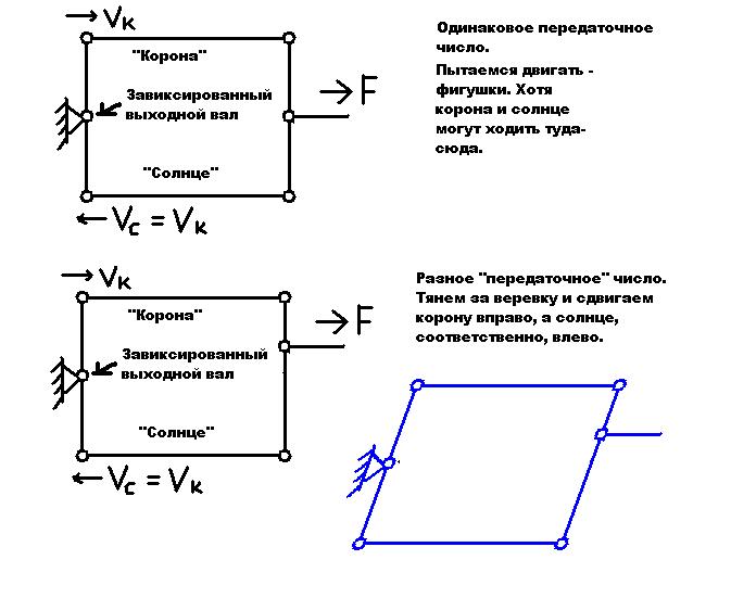 Если передаточные разные, то вот что происходит. Застопоренное выходное водило жестко задает соотношение скоростей солнца и короны. Ну, например, при застопоренном выходном водиле корона делает один оборот против часовой, а солнце - два оборота по часовой. Сама скорость произвольна, застопоренное водило жестко задает лишь СООТНОШЕНИЕ скоростей.