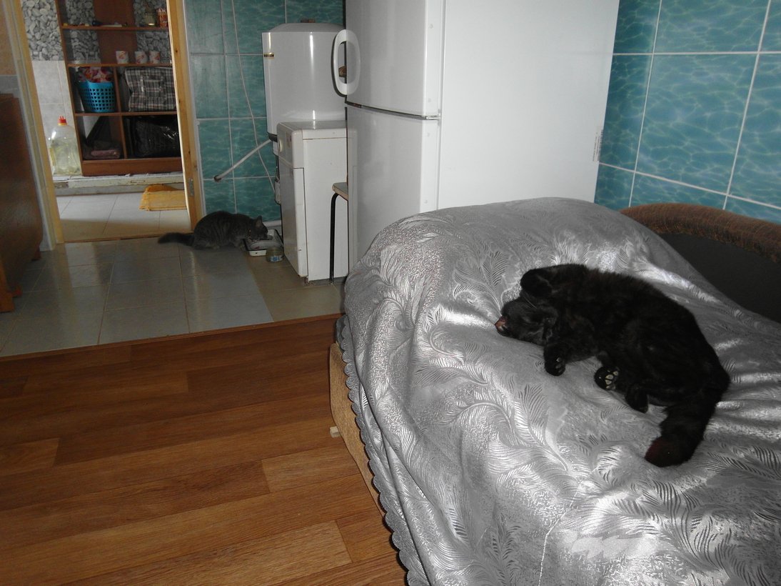 Белым отображение то что не менялось, черным - найденные изменения (порог определения 10см), такие как рука и шевелящийся кот (опорный кадр уже с котом иначе он был бы виден полостью как рука). Мелкие точки по контуру это "шум"-значения подсчитанных расстояний "скачут".Часть отфильтрована этим порогом в 10см. Оставшиеся надо будет отфильтровывать по размеру. Повышать порог плохой вариант, в случаях когда кот идет вдоль стенки.