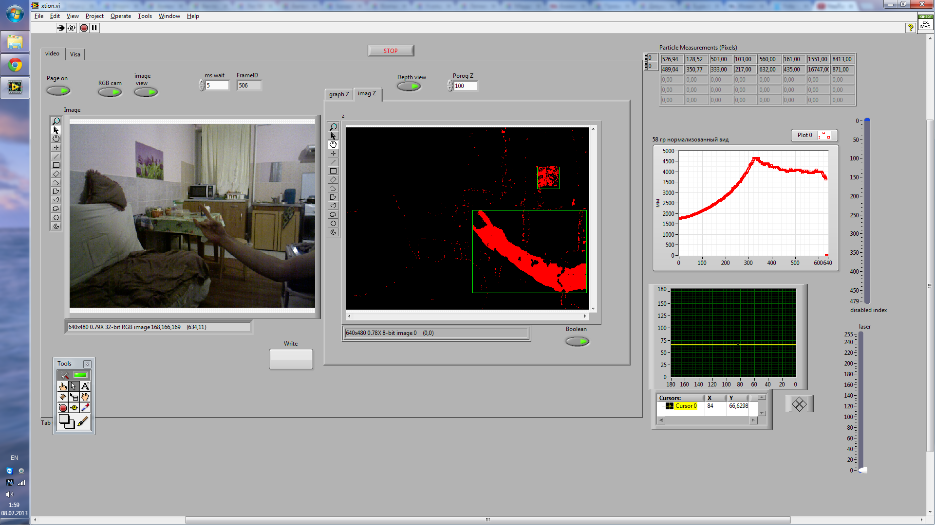 Новости по проекту. в ПО я добавил функцию поиска расстояния до центра объекта. хотел сначала вырезать конкретно объект и искать среднее значение, но там периодически попадают участки фона. а еще в зависимости от шума в центре, приходится искать соседние точки. и это работает даже если объект бублик - ибо получается еще тень в дырке(расстояние до фона не видно), которая опять же не учитывается. на коте должно работать в большинстве случаев. не будет работать на обруче ))