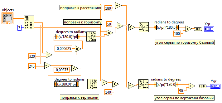формулы расчета наведения не делал еще. как бы у меня все готово для охранного режима. есть координаты (в пикселях на картинке) объектов, расстояния до них. но чтоб попасть надо учитывать положение серв относительно камеры, перемещение форсунки в разных углах положения серв и траекторию струи. от ШИМ управления водометом я отказался. при низком заполнении и частоте 490гц(ардуино же) есть ощутимые скачки на линии питания. сервы сума сходят (с водометом они на одной линии).