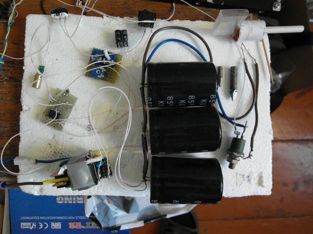 Пушка включает в себя схему зарядки\поддержания заряда. Уже пригодна для стрельбы и дистанционного управления (кнопки на реле поменять и готово). Энергия заряда в конденсаторах около 135Дж (использую 3 банки 470мкФ 450В, реальное напряжение меньше и оно гуляет по мере саморазряда\подзарядки) энергию пули не знаю. Вот пример стрельбы в дно жестяной банки (отверстия средней величины от кончика снаряда).