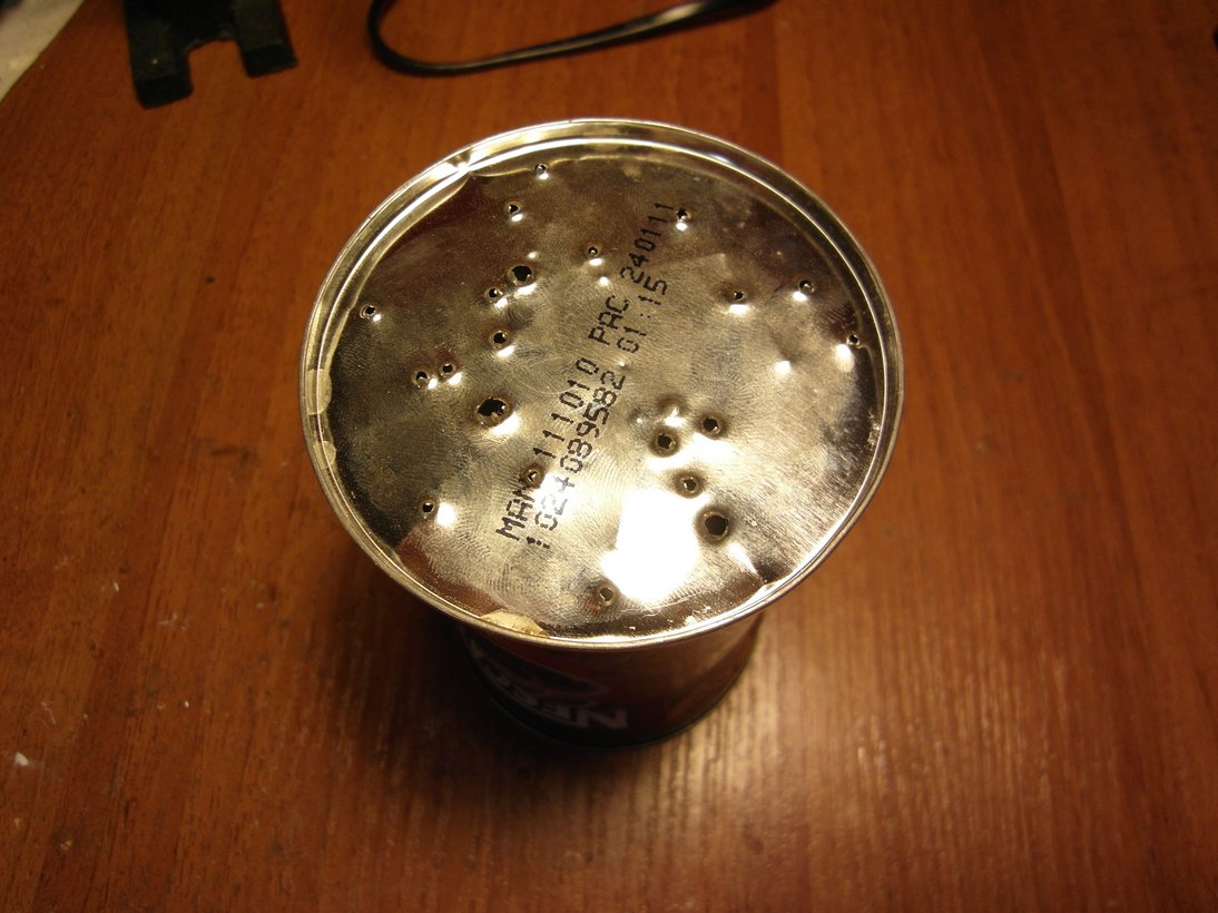 Пушка включает в себя схему зарядки\поддержания заряда. Уже пригодна для стрельбы и дистанционного управления (кнопки на реле поменять и готово). Энергия заряда в конденсаторах около 135Дж (использую 3 банки 470мкФ 450В, реальное напряжение меньше и оно гуляет по мере саморазряда\подзарядки) энергию пули не знаю. Вот пример стрельбы в дно жестяной банки (отверстия средней величины от кончика снаряда).