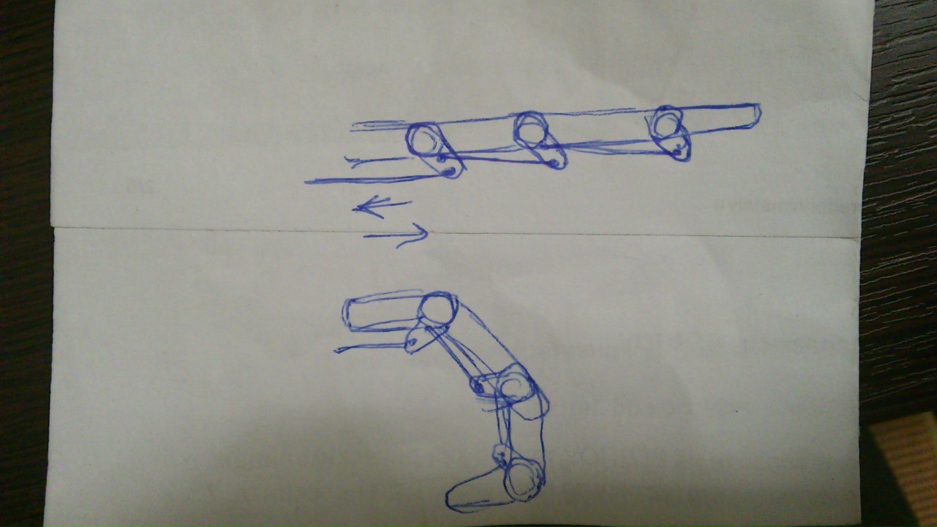 Хм. Что-то я сомневаюсь, что оно будет работать. По крайней мере, что это аналог "моей" конструкции. У меня все углы поворотов равны (в конечных точках по крайней мере, не уверен, что равномерно на каждом отрезке времени передаётся угол, может там какая-нибудь хитрая "синусоида"). А здесь быть такого не может, раз уж разные радиусы для точек крепления рычагов. Каждый сустав будет сгибаться всё меньше и меньше.на заводе видел такую конструкцию. набросал по памяти